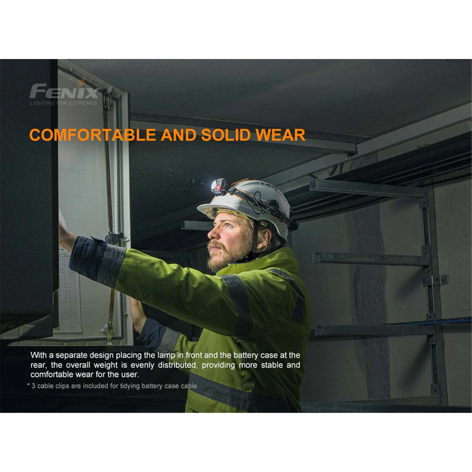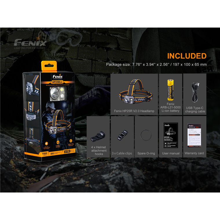 The Fenix HP25R V2.0 is a rechargeable work headlamp that provides an ultra-long runtime of 400 hours on low mode. Powered by its included 5000mAh Li-ion battery, this headlamp can deliver a max output of 1600 lumens. There is a separate battery case located on the headlamp's rear; this unique battery case includes a USB Type-C charging port for easy and fast charging. 60° tilt mechanism allows you to direct light where needed and the lockout function avoids accidental activation. For all-night exploring or work demands, the Fenix HP25R V2.0 headlamp never fails you.