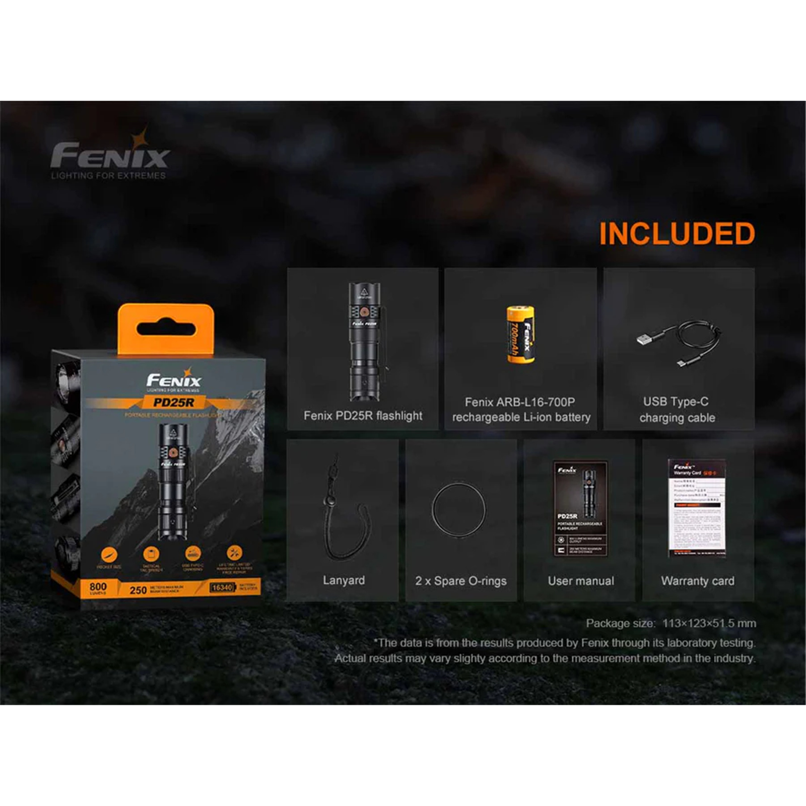 Fenix ARB-L16-700P rechargeable li-ion battery, USB Type-C charging cable, lanyard, 2 x spare O-rings, two-position body clip