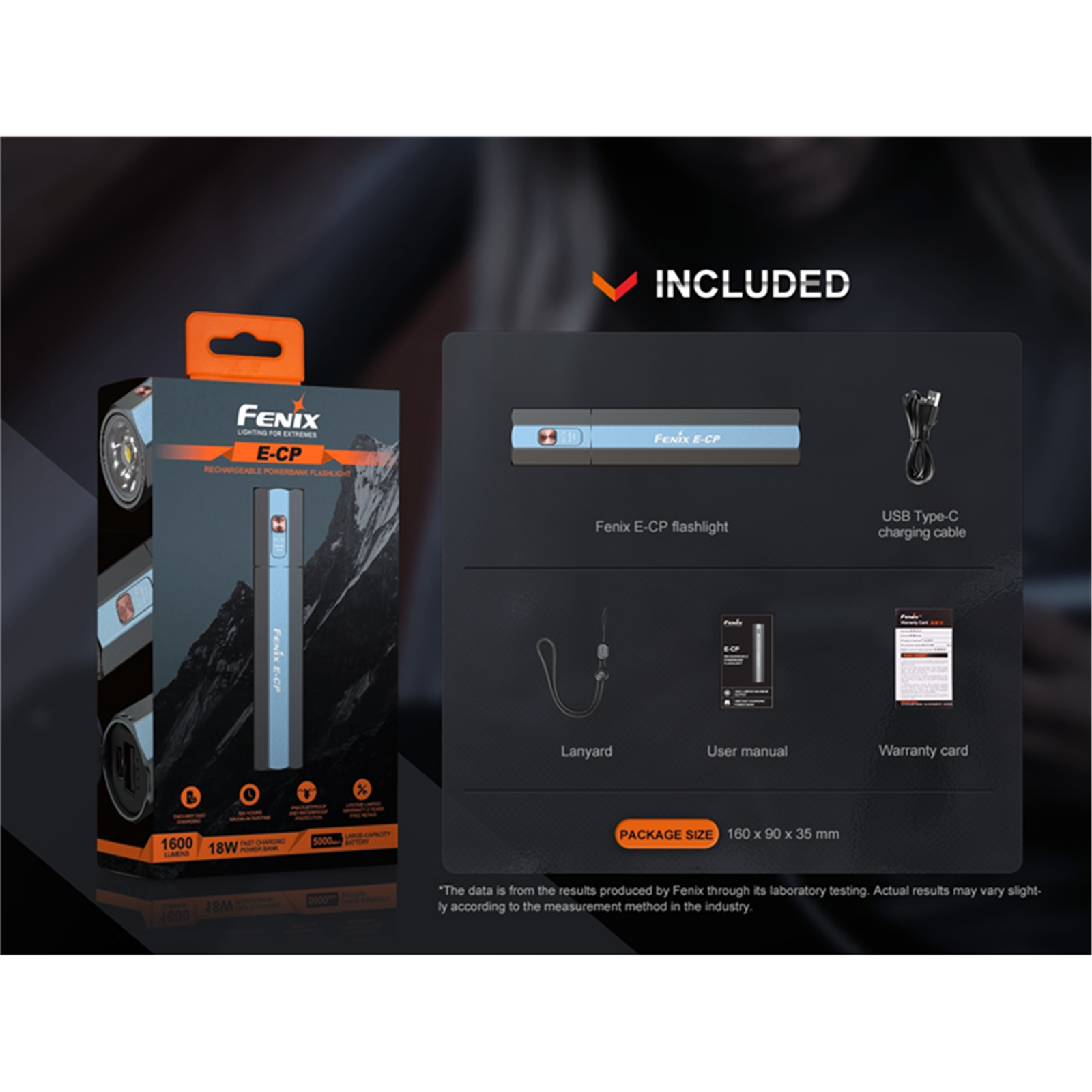 Fenix EDC & Outdoor E-CP PowerBank Flashlight Max 1,600 Lumens. Black, Head: 1.10", 28mm, Build-In 5,000mAH Li-polymer Battery & USB-C Charging Port, Aluminum, USB-C Charging Cable is Included, 2 Years Free Repair Warranty, Battery included