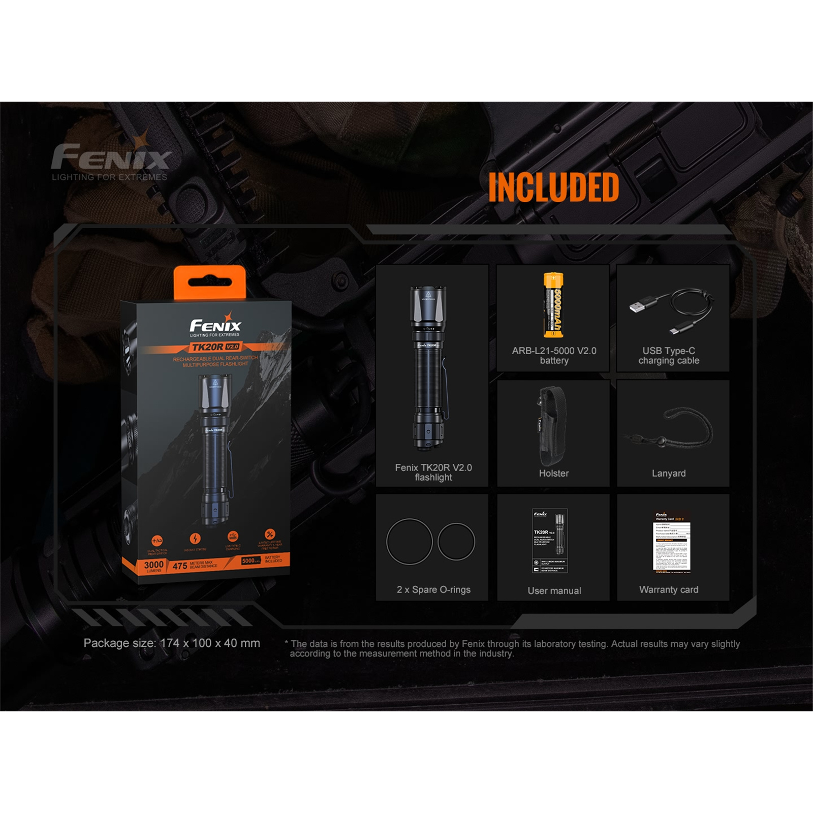 Fenix Tactical Flashlights TK20R V2.0 Rechargable LED Torch Max 3,000 Lumens, Head: 1.34" (34mm), Powered by 1 x 21700 5000mAH Li-ion Battery, One-Handed Operation, Compact, Structure, Hidden USB-C Charging Port, Charging Cable and Battery