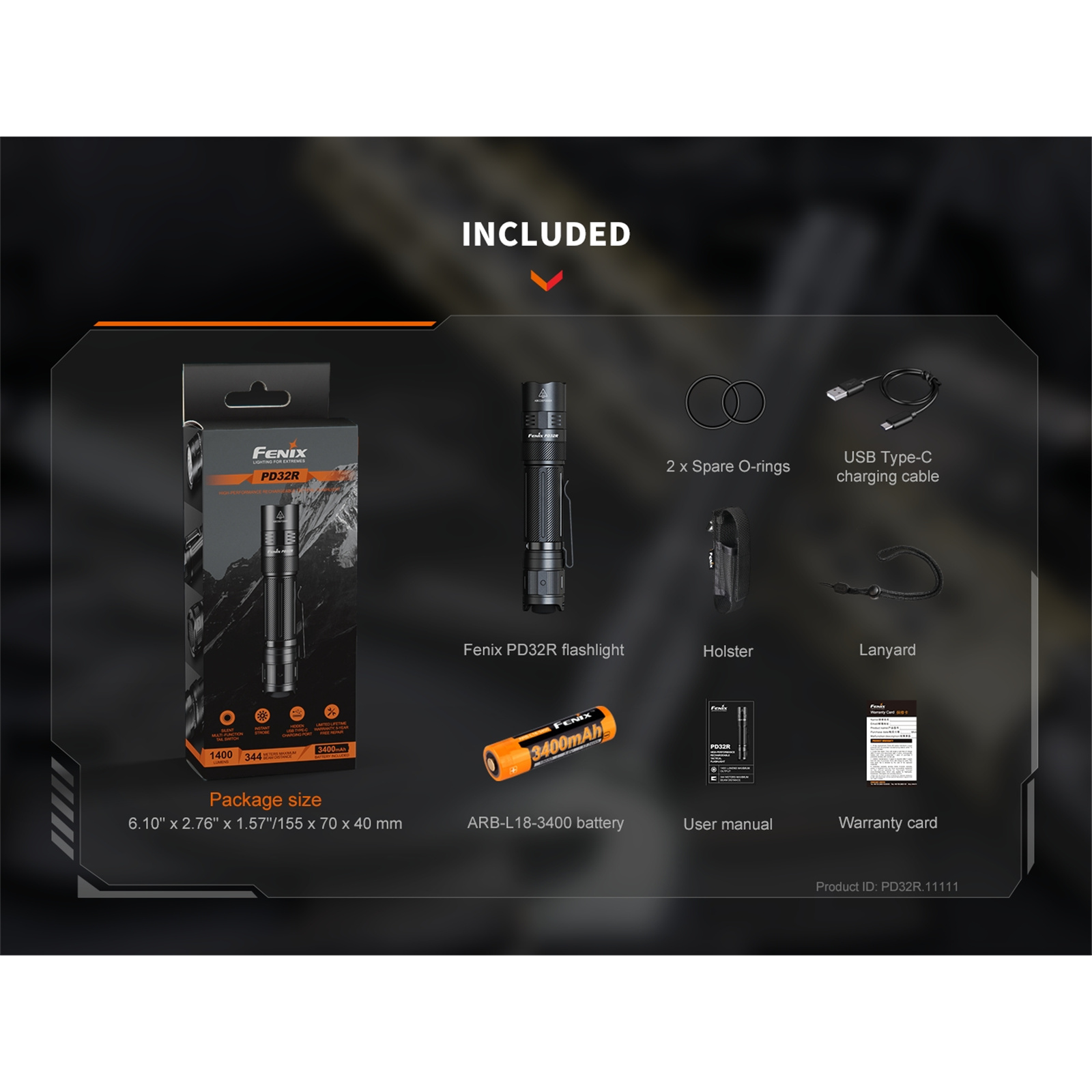 Fenix Tactical & Ourdoor Flashlights PD32R Black Compact Tactical Torch Max 1,400 Lumens, Head: 1.04" (26.4mm), 344m Beam Distance - Powered by 1 x 3,400 mAH Li-ion Rechargeable Battery Included, USB-C Charging Cable - 5 Years Free Repair