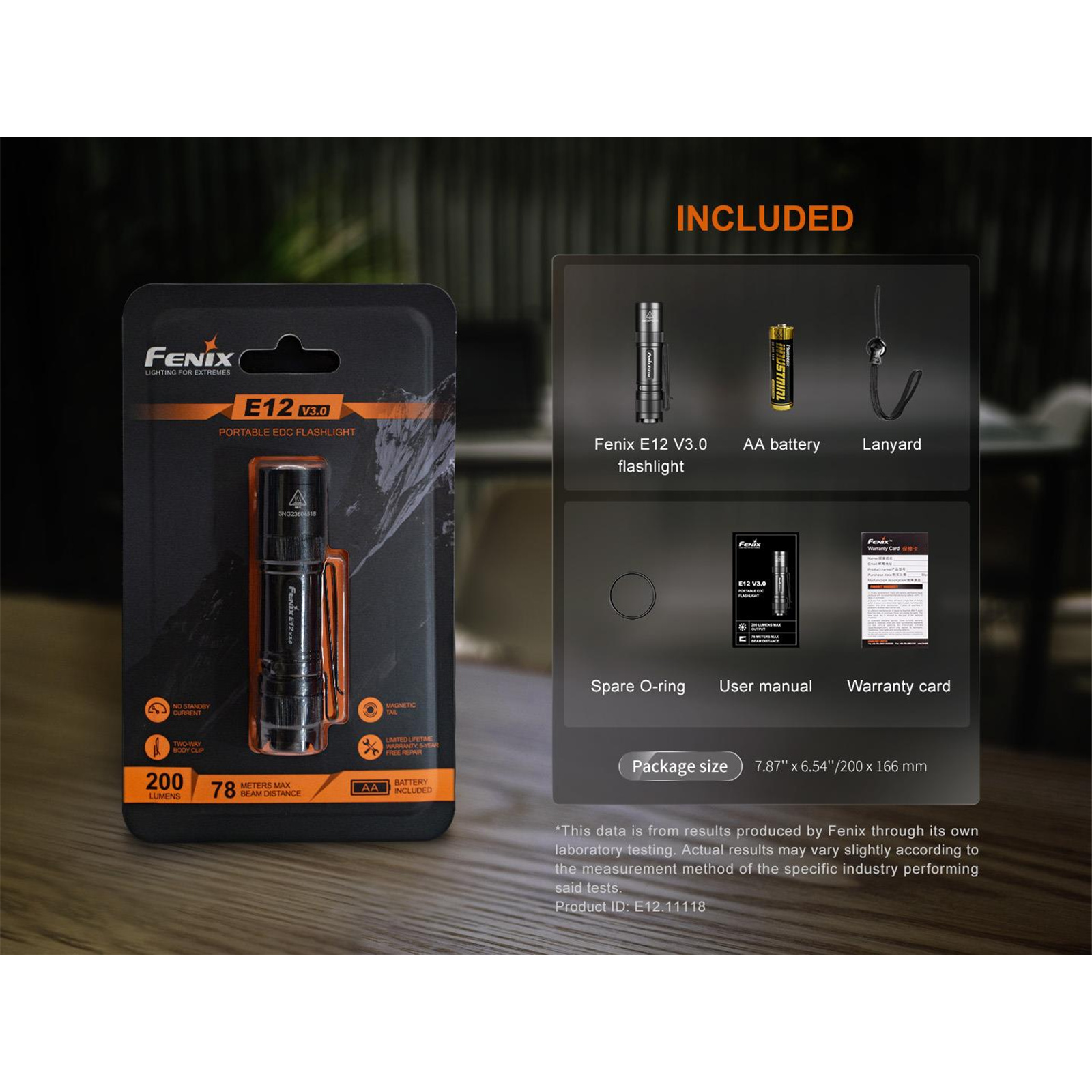 The Fenix E12 V3.0 is a lightweight portable EDC flashlight.Powered by a single AA battery, the flashlight has a maximum output of 200 lumens and can throw a beam up to 78 meters to meet your lighting needs. Battery power will not be consumed in standby status,which provides sufficient power for each use.Two-way body clip and magnetic tail allow for convenient and hands-free use. Additional highlights include tail standing capability and IP68-rated protection. Whether you are on the job or on the go the Fenix E12 V3.0 will always be there to light the way.