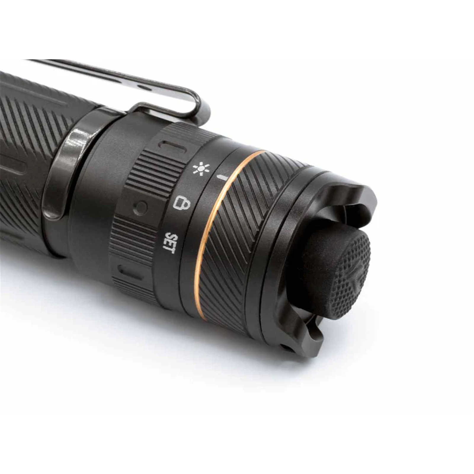 - With the light switched on, rotate the mode selector ring to "" to lock the currently selected output. Pressing or tapping the tactical tail switch cannot change the output or turn off the light.