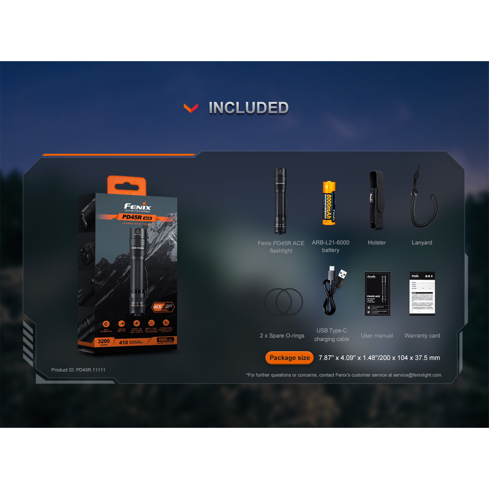 Fenix Tactical & Ourdoor Flashlights PD45R ACE High-Powered LED Torch Max 3,200 Lumens, Head: 1.02" (25.9mm), Max 410m Beam Distance, Powered by 1 x 21700 6,000 mAH Li-ion Rechargeable Battery Included, Build-In USB-C Charging Port, 5-Years