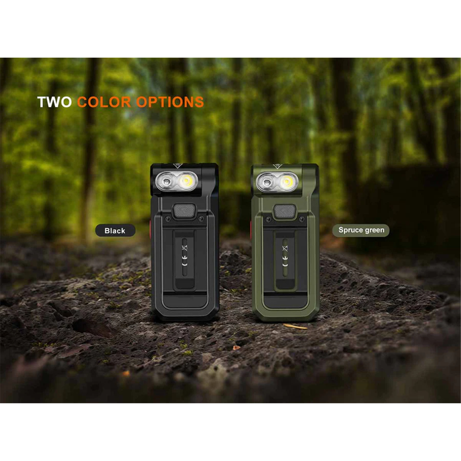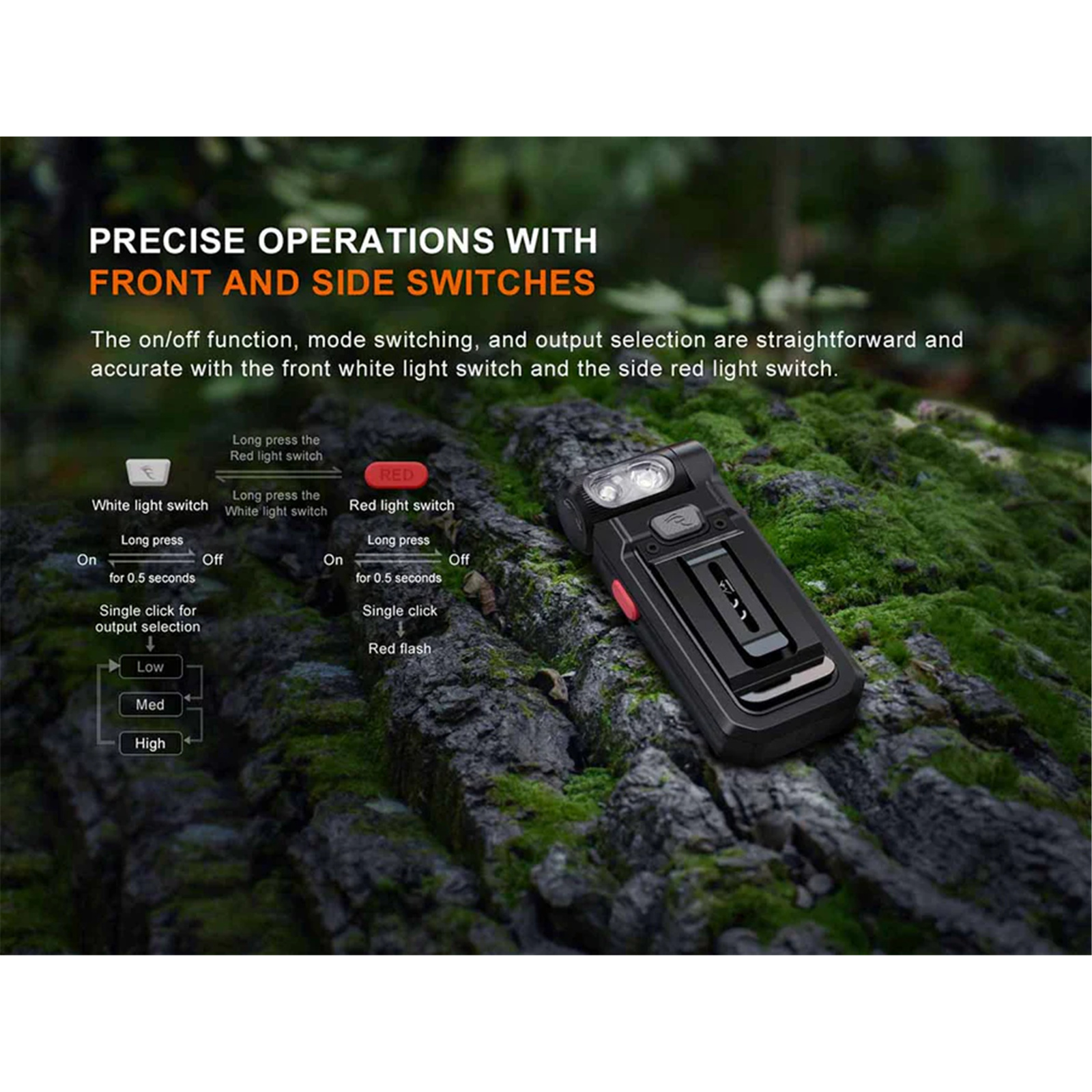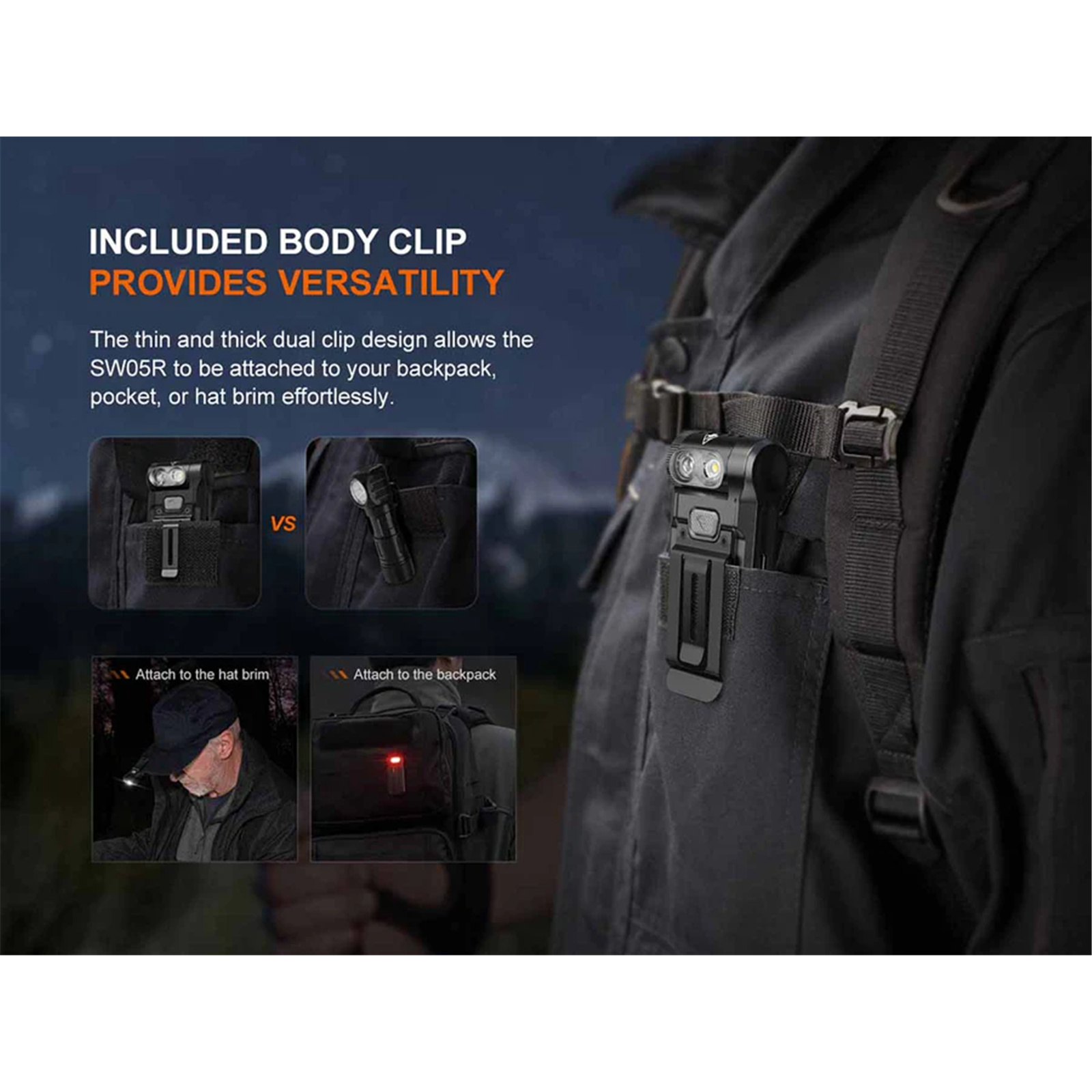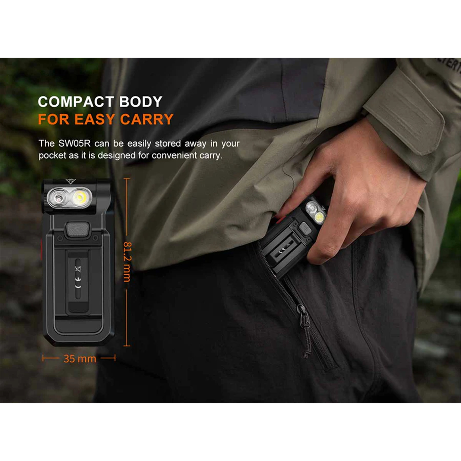 The Fenix SW05R-RED is a powerful yet tiny rechargeable flashlight that delivers a maximum output of 150 lumens and a maximum beam distance of 39 meters. Designed for outdoor adventurers, this light offers both white and red light sources to meet various lighting needs. The 200° adjustable light head angle allows for illumination from multiple directions. Individual switches control each light source for accurate and fast operation. Powered by a built-in 700mAh, it's fully rechargeable via the inner waterproof USB Type-C charging port. The light tail features a strong magnet for hands-free use on magnetic surfaces. Its included body clip provides secure attachment to your pocket, hat brim, or backpack strap. Ready to explore the outdoors, it boasts an IPX6 waterproof rating. With its reliable features, the SW05R-RED ensures dependable lighting for various outdoor adventures, whether you're trekking, mountaineering, or camping.