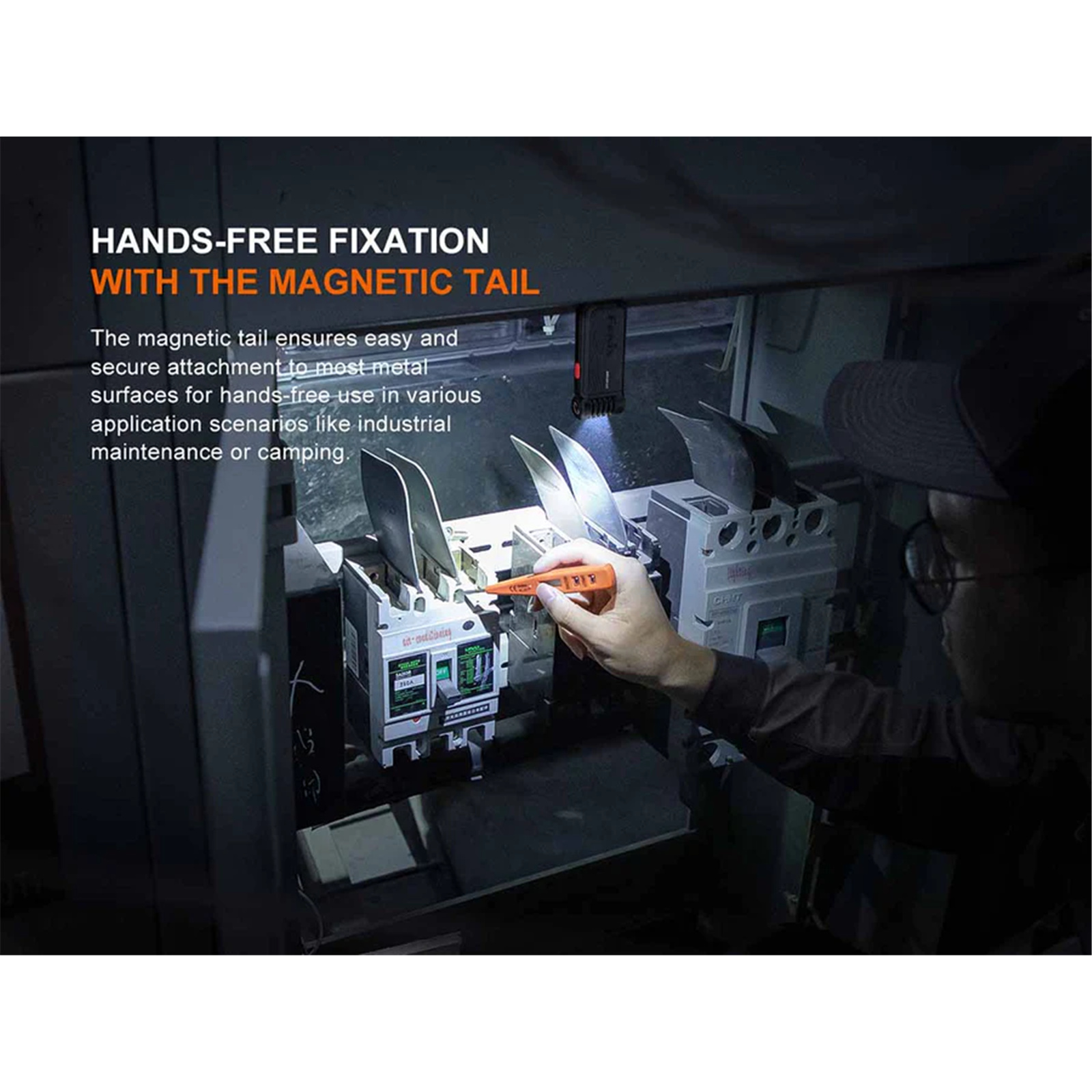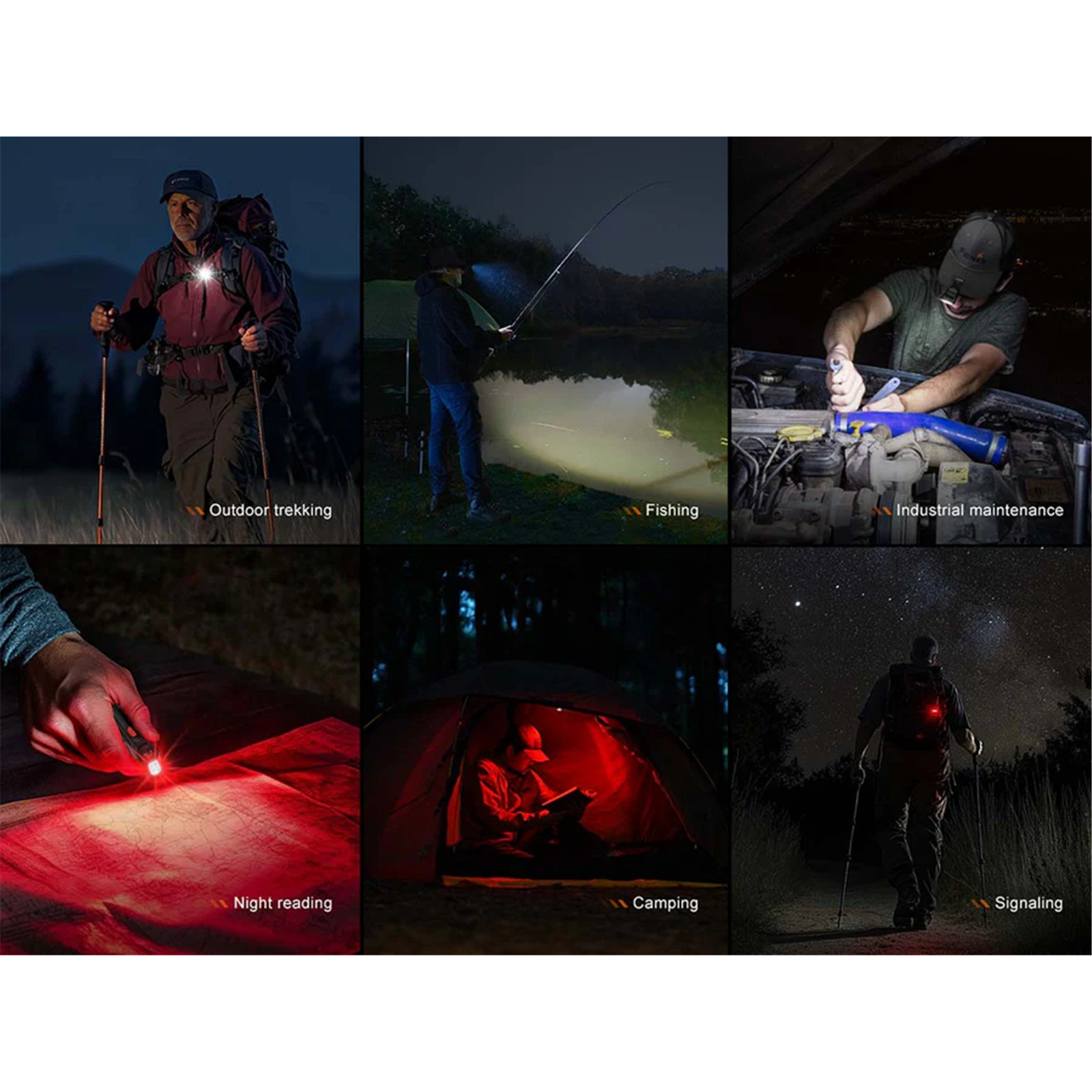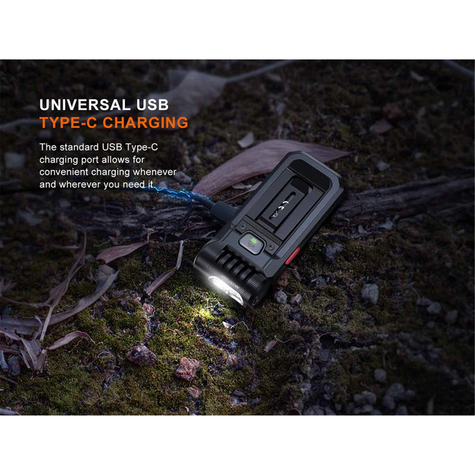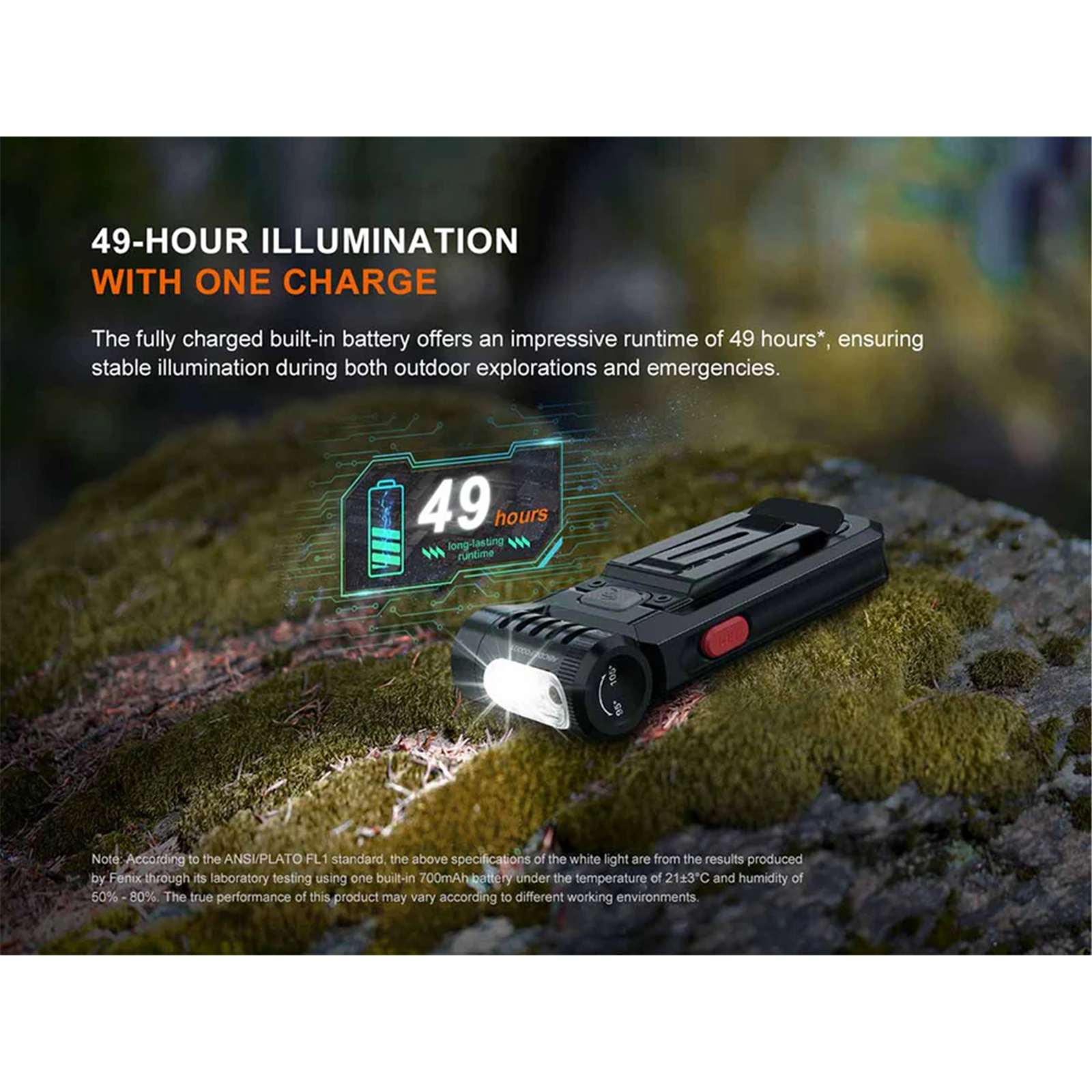 The Fenix SW05R-RED is a powerful yet tiny rechargeable flashlight that delivers a maximum output of 150 lumens and a maximum beam distance of 39 meters. Designed for outdoor adventurers, this light offers both white and red light sources to meet various lighting needs. The 200° adjustable light head angle allows for illumination from multiple directions. Individual switches control each light source for accurate and fast operation. Powered by a built-in 700mAh, it's fully rechargeable via the inner waterproof USB Type-C charging port. The light tail features a strong magnet for hands-free use on magnetic surfaces. Its included body clip provides secure attachment to your pocket, hat brim, or backpack strap. Ready to explore the outdoors, it boasts an IPX6 waterproof rating. With its reliable features, the SW05R-RED ensures dependable lighting for various outdoor adventures, whether you're trekking, mountaineering, or camping.