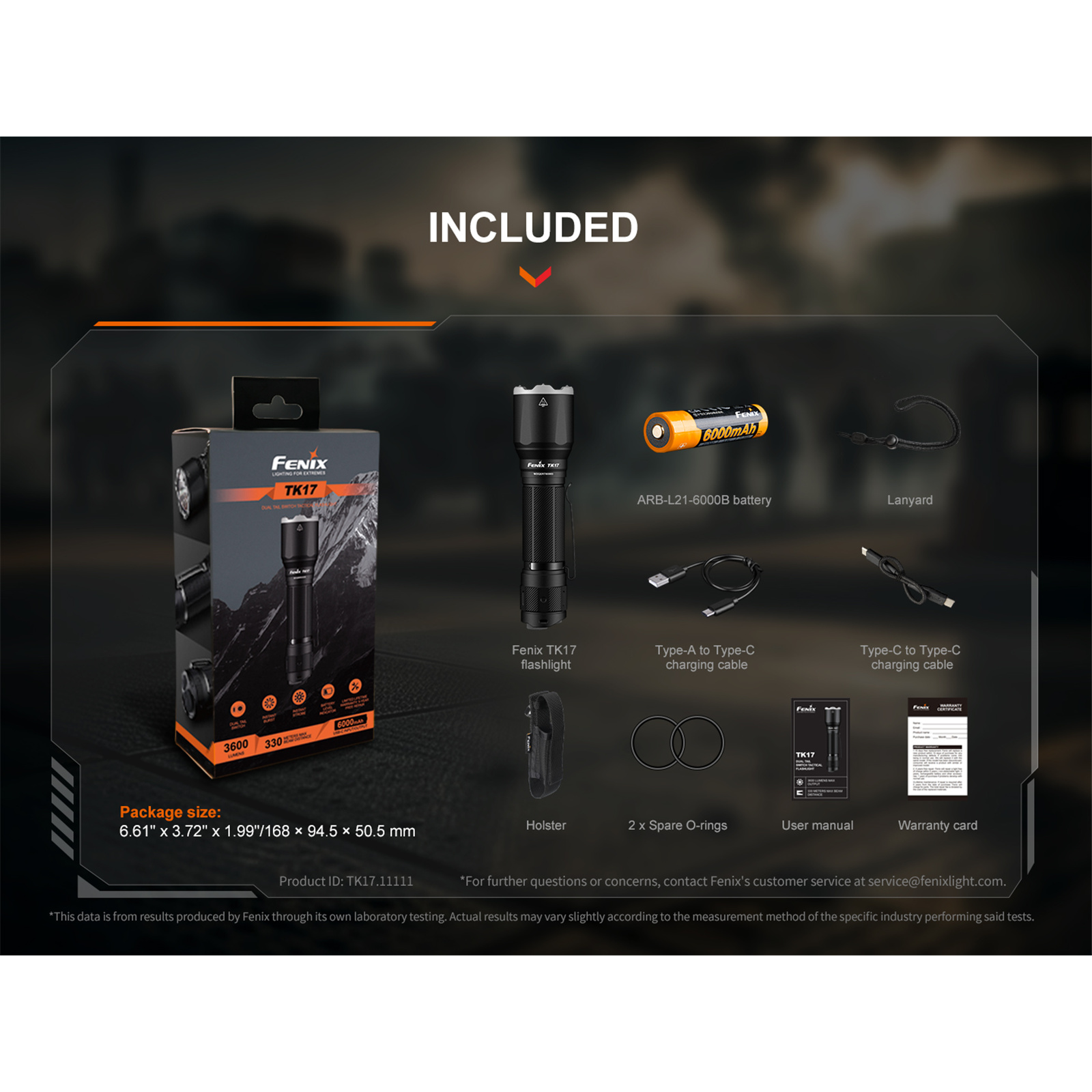 The Fenix TK17 is a versatile tactical flashlight with a dual switch for instant strobe as well as instant burst. It delivers a max output of 3600 lumens and can run for up to 60 hours with the single included 6000mAh USB-C rechargeable battery that can charge other devices. Its newly designed battery level indicator provides real-time updates on your battery's status, ensuring you always stay informed. With its compact size and impressive light power, we recommend the TK17 for tactical needs, law enforcement, and SAR missions.