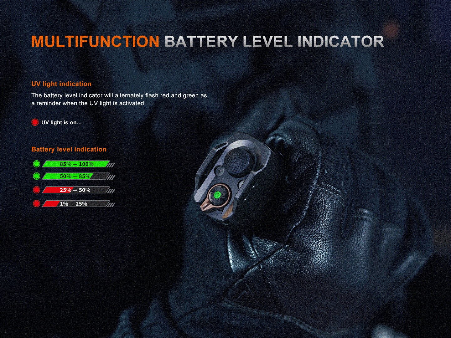 Since UV light is generally invisible to the human eye, users may overlook its presence in bright environments. To prevent unnecessary loss or damage from accidentally leaving the UV light on, the battery level indicator in the functional switch will alternately flash red and green as a reminder when the UV light is activated.