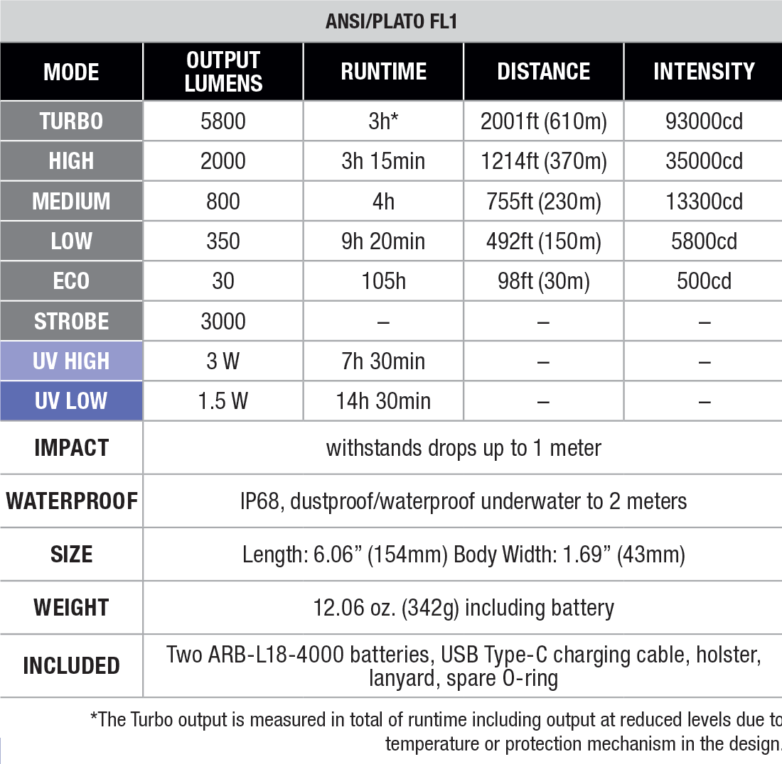 Two ARB-L18-4000 batteries, USB Type-C charging cable, holster, lanyard, spare O-ring