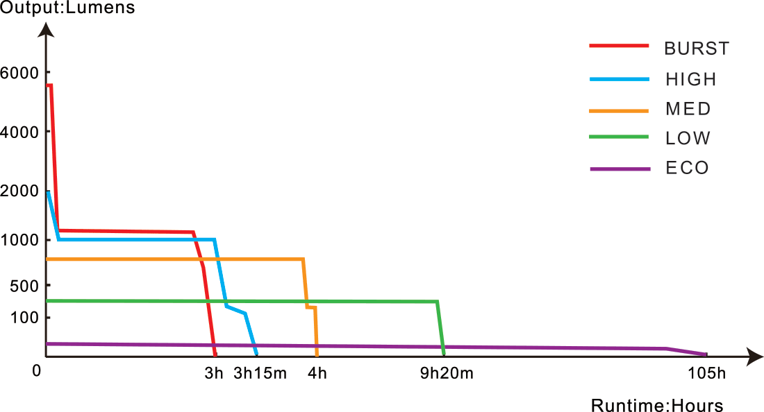 - General mode: with the light turned on, single click the functional switch to cycle through Eco→Low→Med→High→Burst.