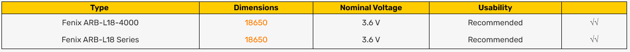 **18650 Li-ion batteries are powerful cells designed for commercial applications and must be treated with caution and handled with care. Using low-quality batteries or mishandling batteries (such as short-circuiting or overheating) could lead to combustion and jeopardize the safety of users and property. Any adverse effects resulting from the use of low-quality batteries are not covered by any Fenix warranty or liability. Using quality batteries with circuit protection will reduce the potential for combustion or explosion.