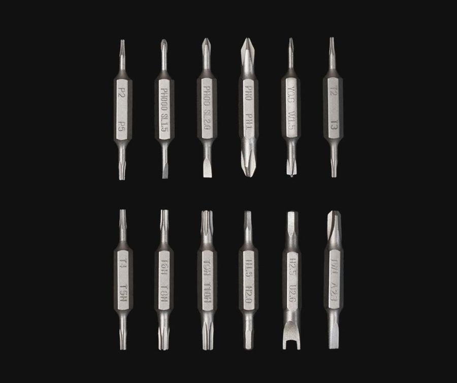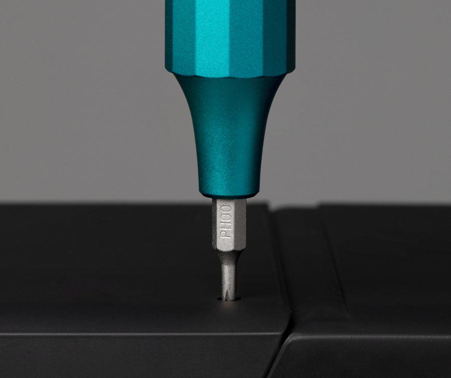 The pen-like case hides a removable backbone that neatly stores 12 double-ended bits, all magnetically attached to the precision screwdriver. Take and place bits with a simple "click".