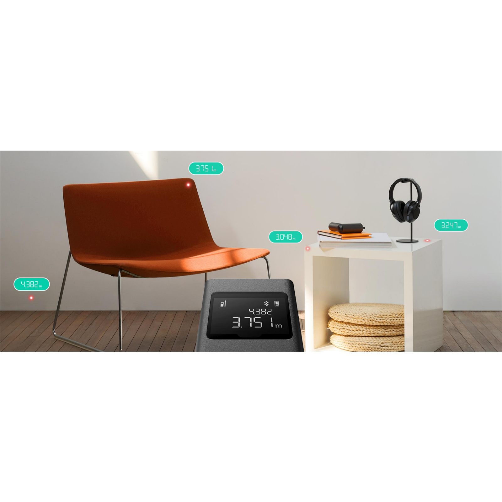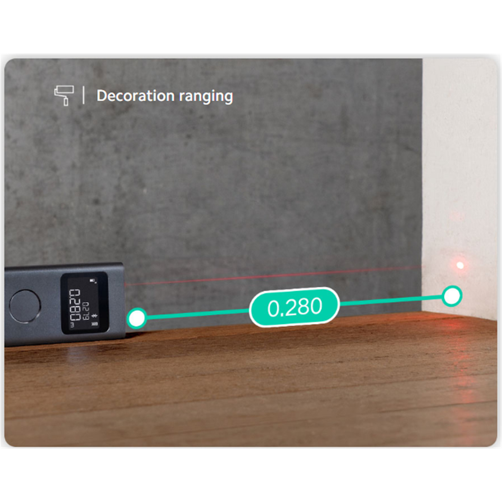 By connecting a smartphone via Bluetooth, you can link the laser measure with Mi Home/Xiaomi Home app to realise more functions such as data synchronisation/remarks, length/area/volume calculation, floor plan mapping, map sharing, and effect viewing.
