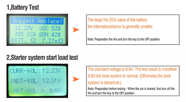 - Easily read out conclusion of battery condition good/OK/pay attention/replace as suggestion.