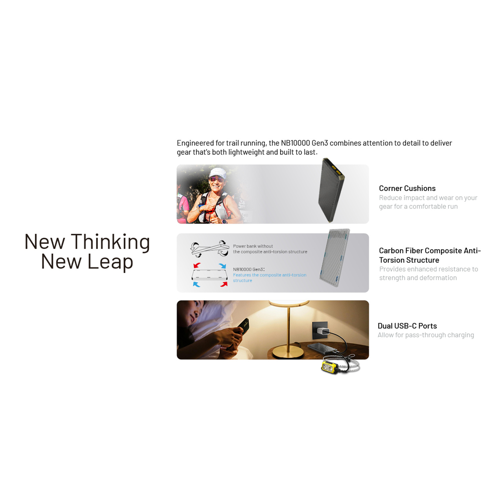 The NB10000 Gen3 is a lightweight carbon fiber power bank with a 10,000mAh capacity and 22.5W fast charging. Weighing only 150g, it features dual USB-C ports, a carbon fiber composite anti-torsion structure, and 4 corner cushions, ideal for powering smartphone, headlamps, flashlights, earphones and more