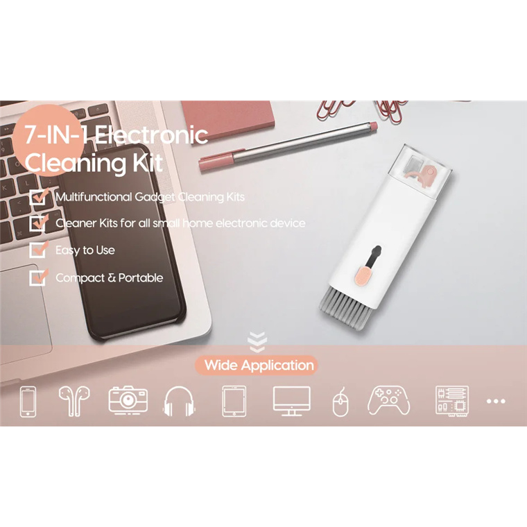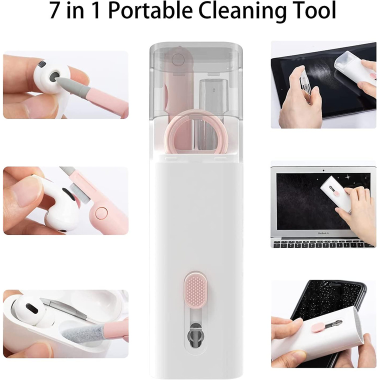 This 7 in cleaning kit includes 1 large high-density brush, 1 swipe, 1 earphone cleaning pen(include Silica gel tip, flock sponge and mini high-density brush) , 1 key puller , 1spray bottle. This multi-fuction cleaner ser can meet your any demands to clean electronics at home.