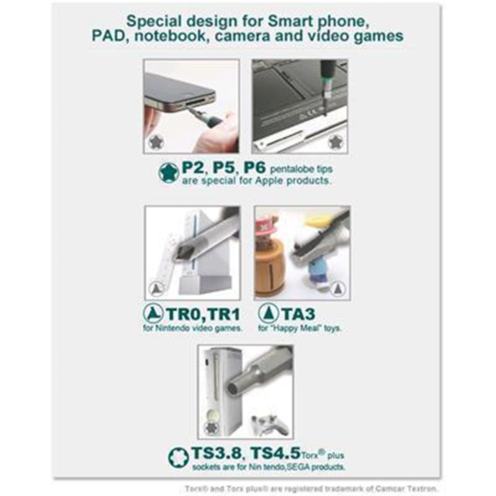 Pro'sKit SD-9828 is a set of screwdriver with 55 bits for disassembling smartphones, tablets, notebooks, game consoles, cameras and other electronic devices of popular brands such as Apple, HTC, Samsung, Sony, Microsoft, Nintendo, Sega and more.