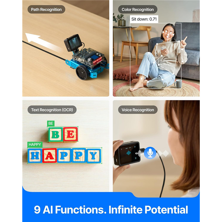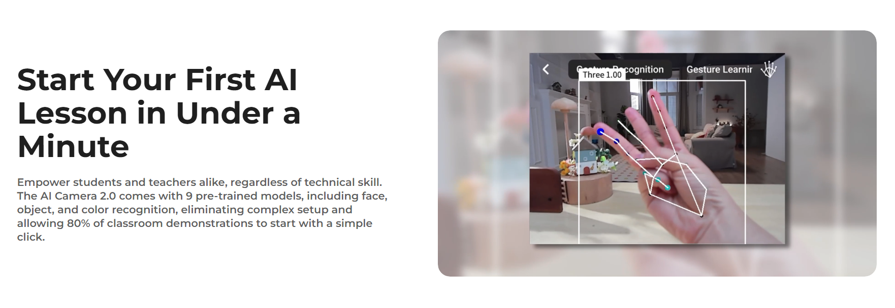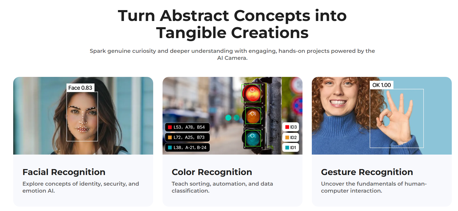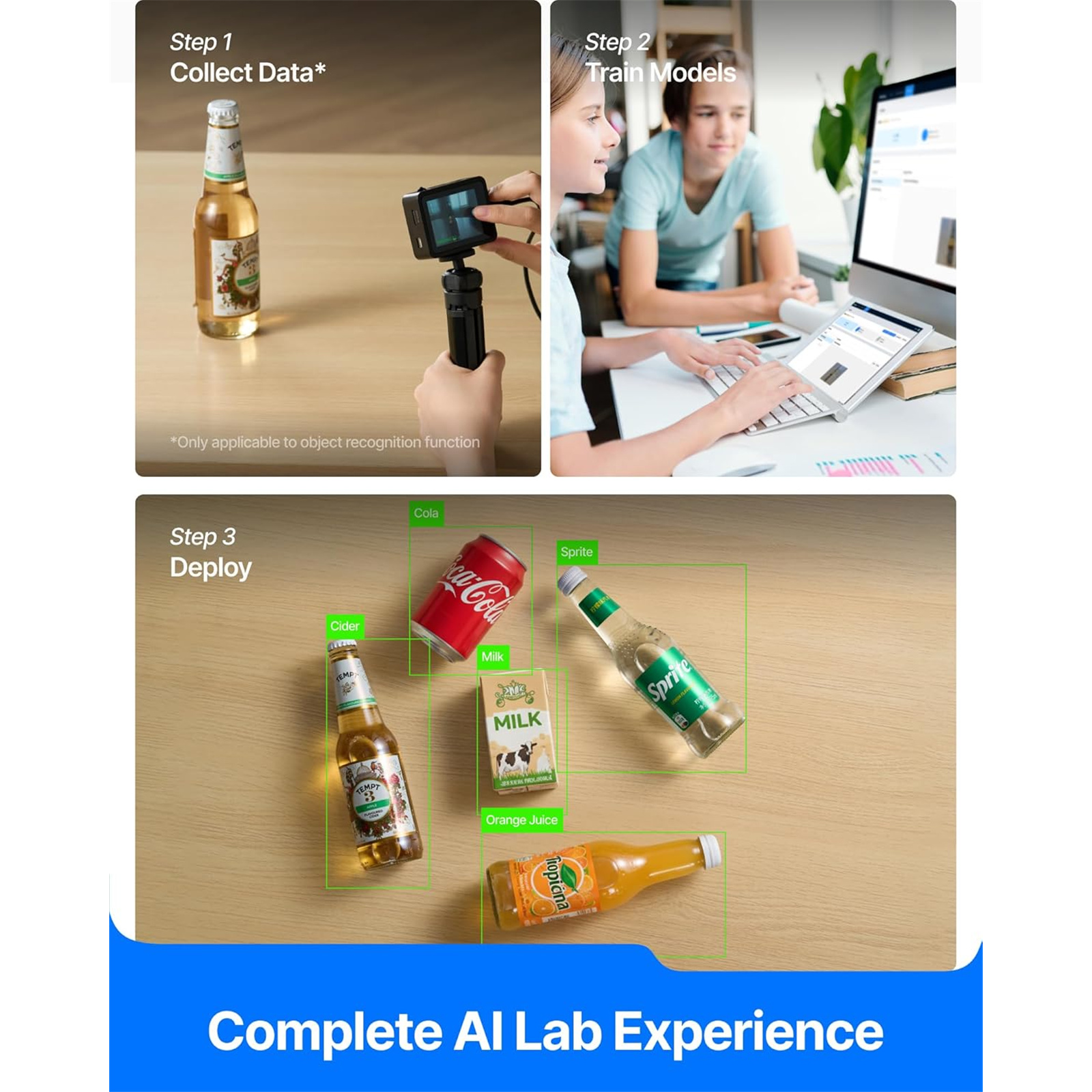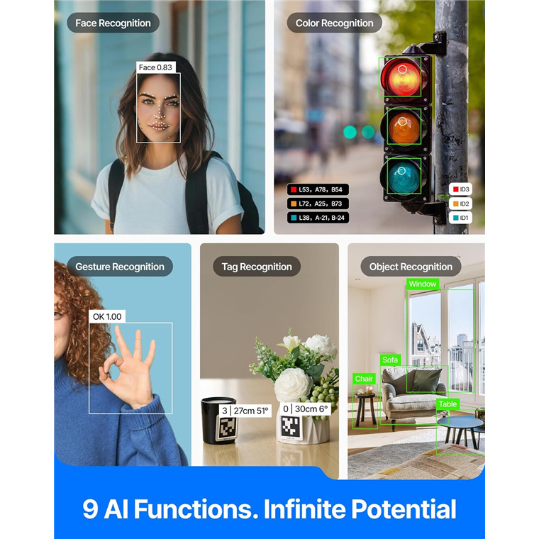 - All-in-One AI Vision for Learning - This AI Camera comes with 9 built-in, ready-to-use models (Face, Color, Gesture, Tag, Object, Path, Posture, Text, and Voice Recognition), making it the ultimate tool to introduce AI concepts in the classroom without any complex setup.