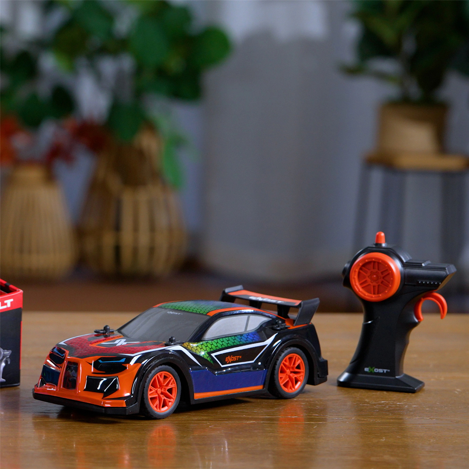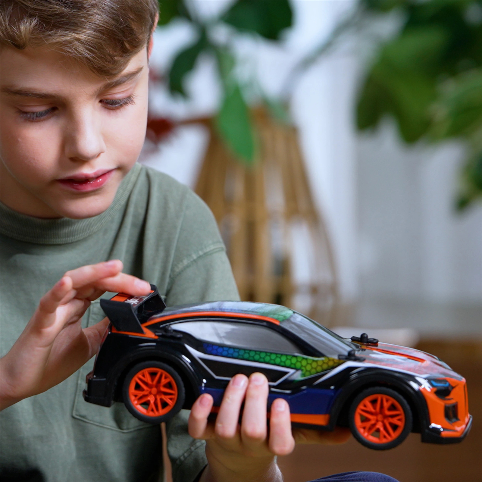 Attract all the attention with the new EXOST FUSION BOLT! Watch as dynamic light effects shine through the whole car body with changing colours. Remote control revving engine sound in sync with acceleration when you drive on race tracks. Play exciting music with just a press of a button! Show your attitude with unique EXOST car body design and use a type-C cable to recharge the batteries easily.