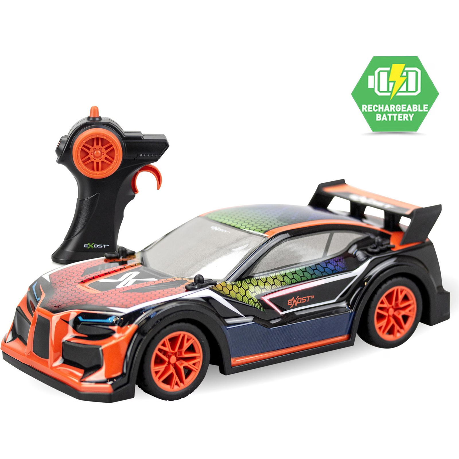 Attract all the attention with the new EXOST FUSION BOLT! Watch as dynamic light effects shine through the whole car body with changing colours. Remote control revving engine sound in sync with acceleration when you drive on race tracks. Play exciting music with just a press of a button! Show your attitude with unique EXOST car body design and use a type-C cable to recharge the batteries easily.