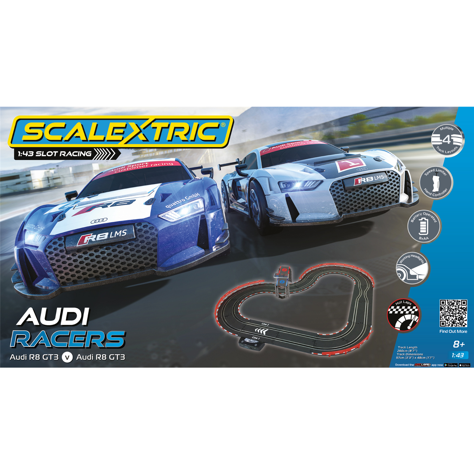 Recreate the exciting world of high-speed racing with these two Audi R8 GT3 racing cars. Negotiate the bends, speed through the chicane and go full throttle on the straights to beat the other driver. Complete with Scalextric's exciting new Hot Laps app and gantry, drivers can track lap times and race in both real and virtual time with arcade style games. With four different layout options and variable speed control every race is different.