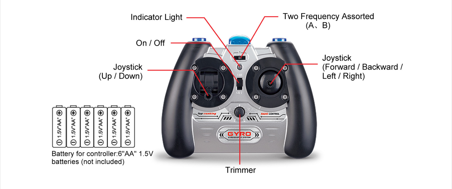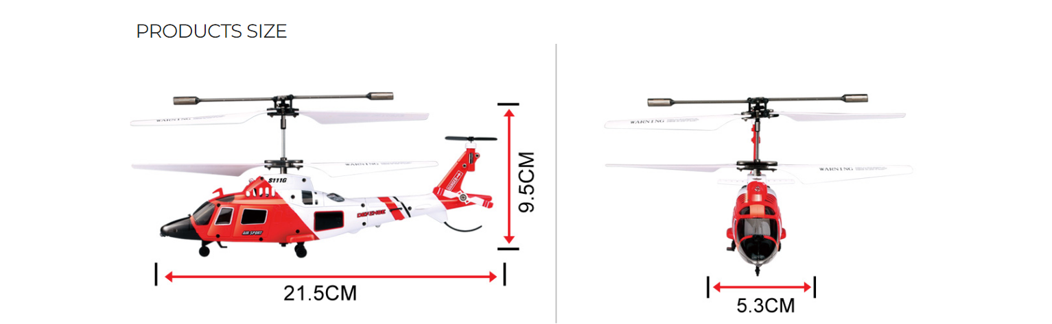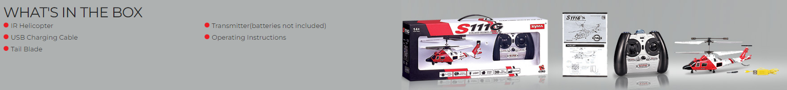 Syma S111G 3.5 Channel RC Helicopter with Gyro. Flight Control Includes Up/Down, Left/Right Turn, and Forward/Backward movements. Includes USB Charger, and Spare Tail Blade. For Use Indoors ONLY Due to Infrared Control. Battery Type: Lithium Polymer (LiPO Battery). C Rate: 15C. Volts: 3.7. Capacity: 150mAh. Cell Count: 1S. Continuous Discharge: 15C (2.25A). Watt Hours: 0.56. Motor Type: Brushed. Age Rating: 14+ With Adult Supervision. Charger: USB. Radio: Infrared. Fuel Source: Electric. Length: 8.7 in (220.98mm). Height: 2.2 in (55.88mm). Width/Diameter: 3.7 in (93.98mm).