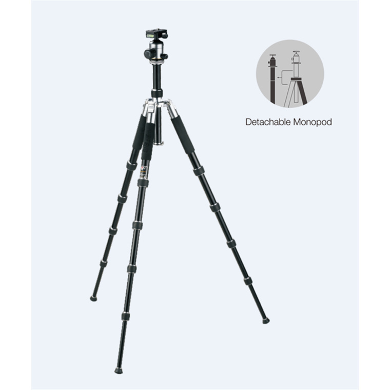 CNC made high intensity aluminum alloytripod is featured with high intensity, good stability, strong constructioncapacity and other features. Unique button adjusting structure makes the tripodachieve low angle shooting quickly. The design of quick removable monopod makestripod meet the demand of different shooting environment.