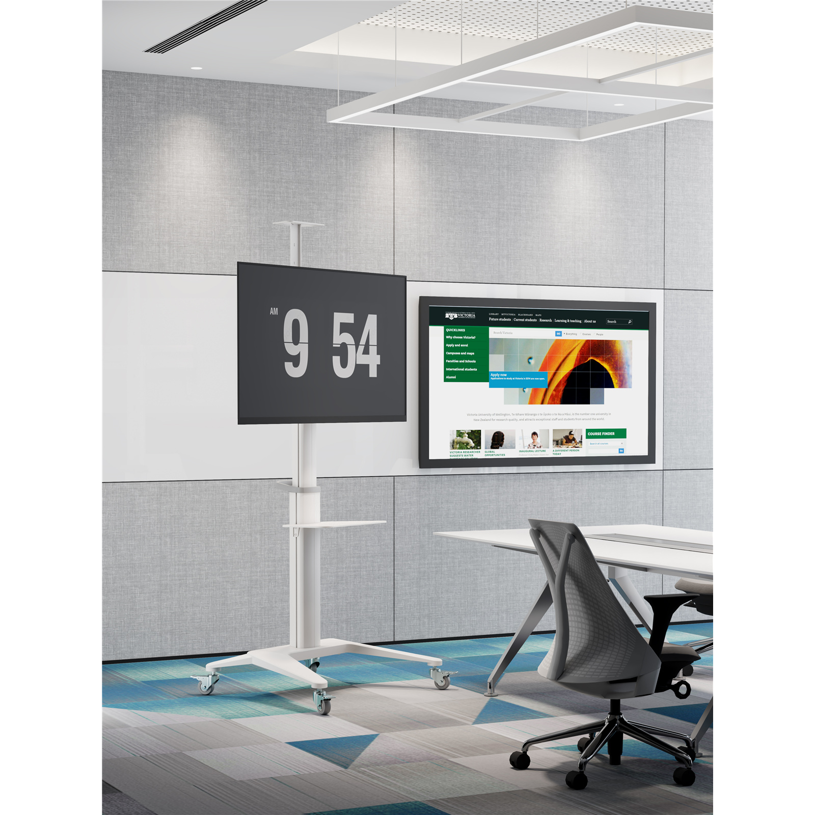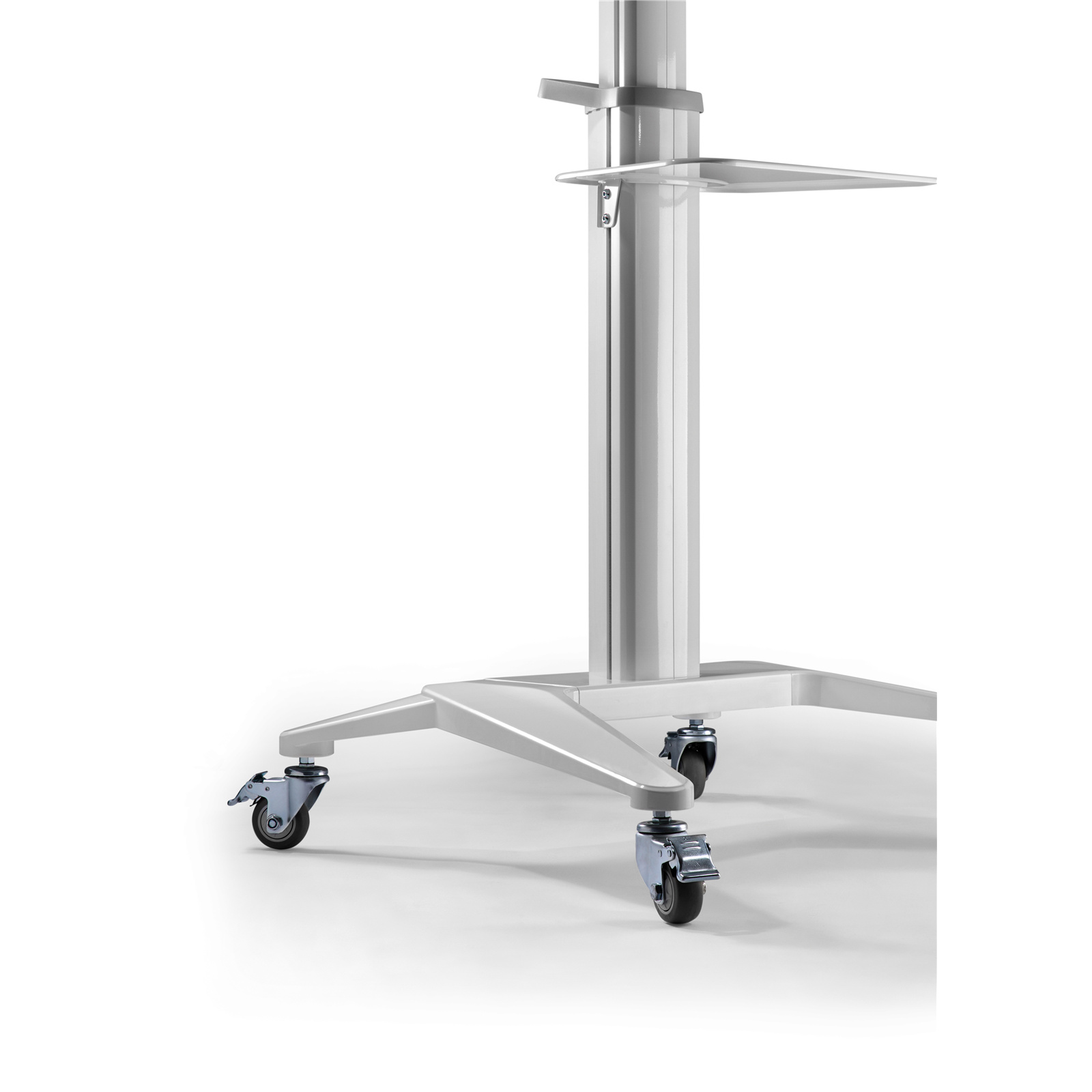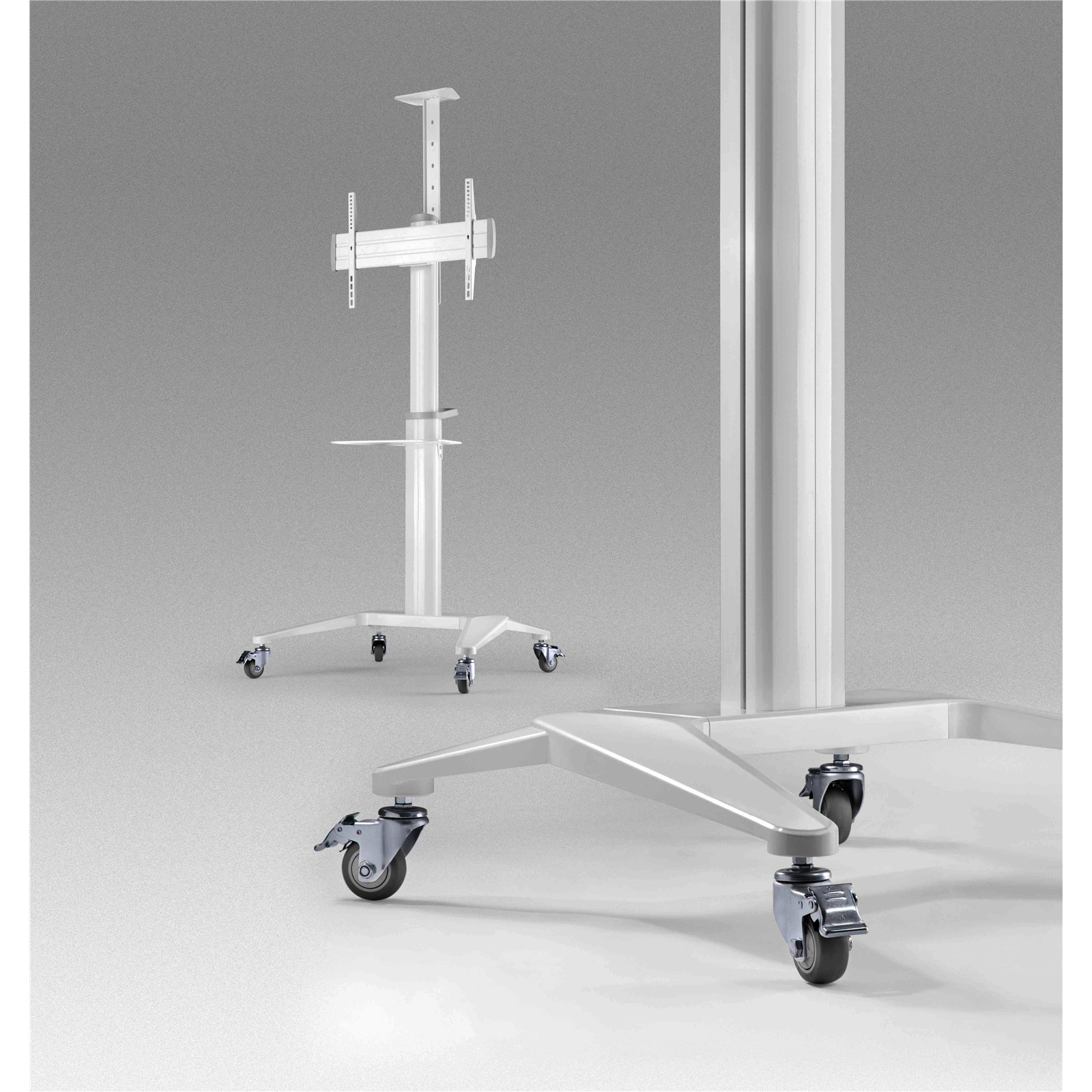This comes with an ultra-strong lightweight aluminum column securely attached to an aesthetically pleasing base that together offers the most stable and secure solution for large and heavy displays. Users can easily flip the TV from landscape to portrait orientation or adjust it to remain at any position along the column. The toolless tilting design offers a variety of viewing angles. The cart is easy to move using the built-in D-ring handle while four lockable casters ensure quiet maximum stability along the way. A height-adjustable camera shelf and equipment tray are provided for devices and materials, and the integrated cable management system keeps wiring organized and protected.