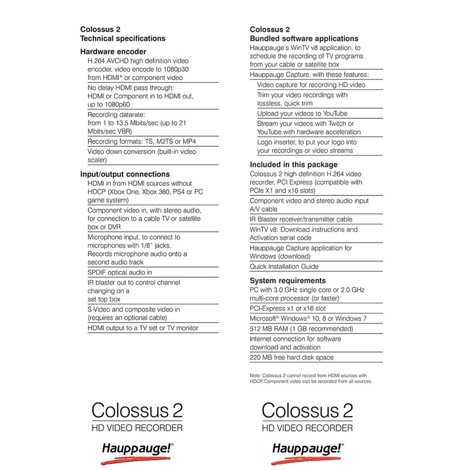 Colossus 2 is an internal video recorder which plugs into PCI Express x1 or x16 slots. It contains the same studio quality video encoder which is used in the HD PVR 2, and can record both HDMI and Component video at up to 1080p30, with support for 1080p60 passthrough.