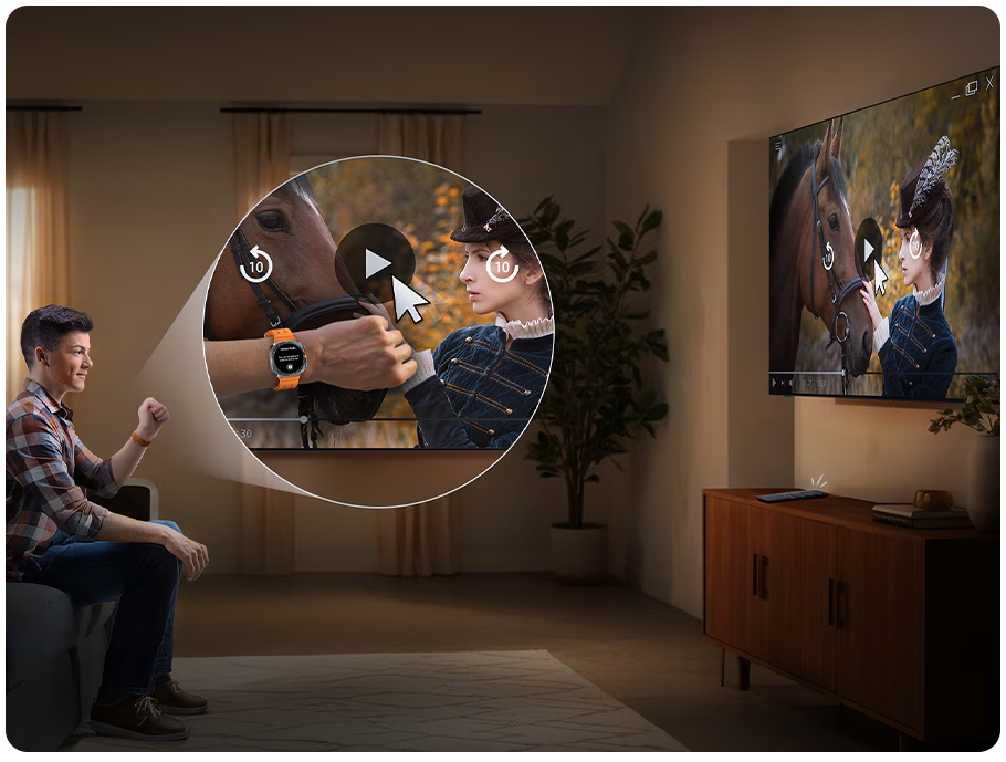 Easily control your TV with your smartwatch. Just wear your Galaxy Watch and use hand gestures*, like pinching to select an option, or moving your wrist back and forth for pause and play.