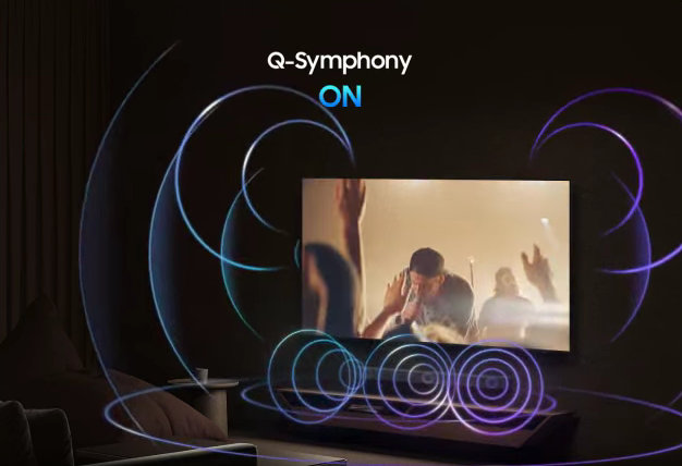 Surround yourself with beautifully orchestrated sound. Samsung technology syncs the TV and soundbar audio* to play simultaneously - without muting the speakers of either device.