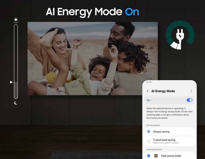 Energy saving made easy with SmartThings. By turning on AI Energy Mode, it auto detects surrounding light levels and analyzes usage behaviors to adjust the brightness. Also, it analyzes the content scene by scene to subtly adjust brightness where possible, to manage energy consumption.