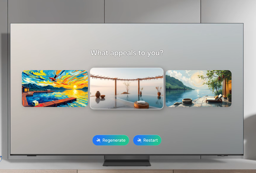Choose keywords for the ambiance you want, and let AI work its magic. Your TV will generate beautiful, one-of-a-kind images that can change the atmosphere of your home.