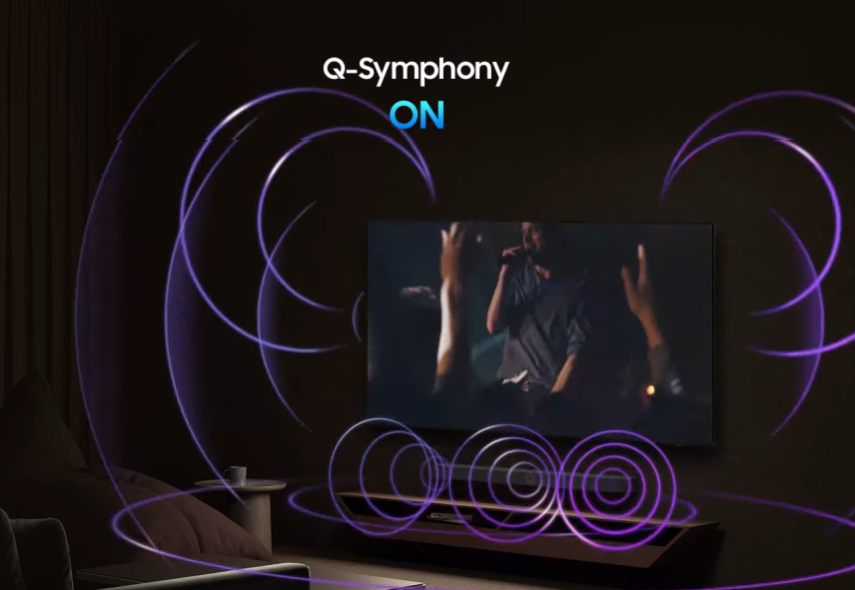 Surround yourself with beautifully orchestrated sound. Samsung technology syncs the TV and soundbar audio* to play simultaneously - without muting the speakers of either device.