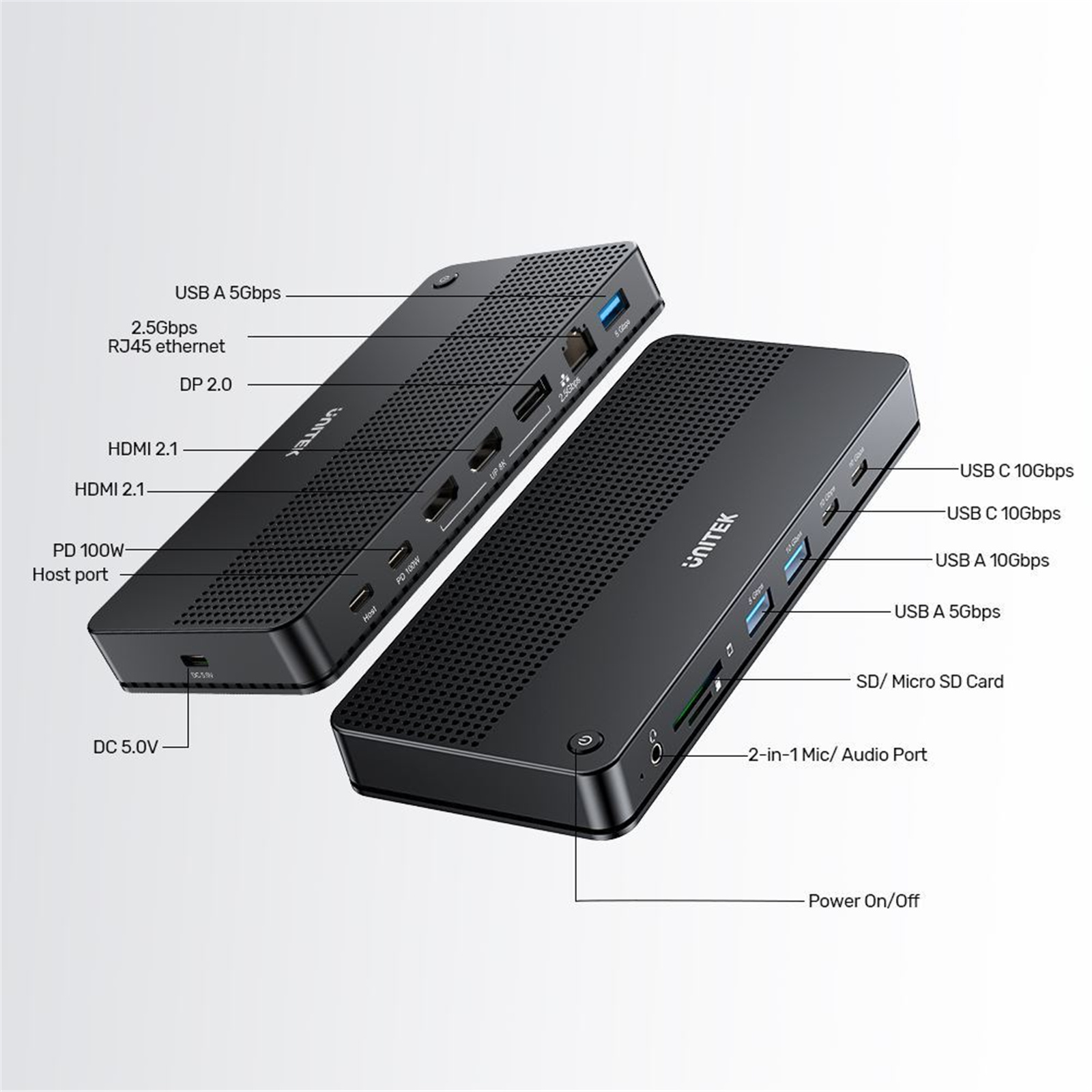 Unitek 13-in-1 USB-C 10Gbps Universal Docking Station with 100W Power Delivery 3x USB-A 10Gbps Ports (2x USB-C & 1x USB-A) - 2x USB-A 5Gbps Ports - 2x HDMI - 2.5G Ethernet - SD/Micro SD - DP with MST