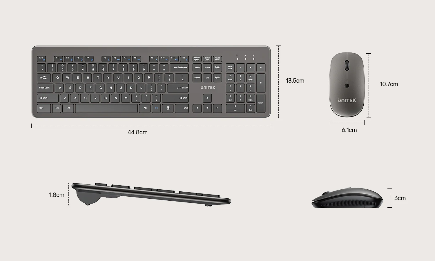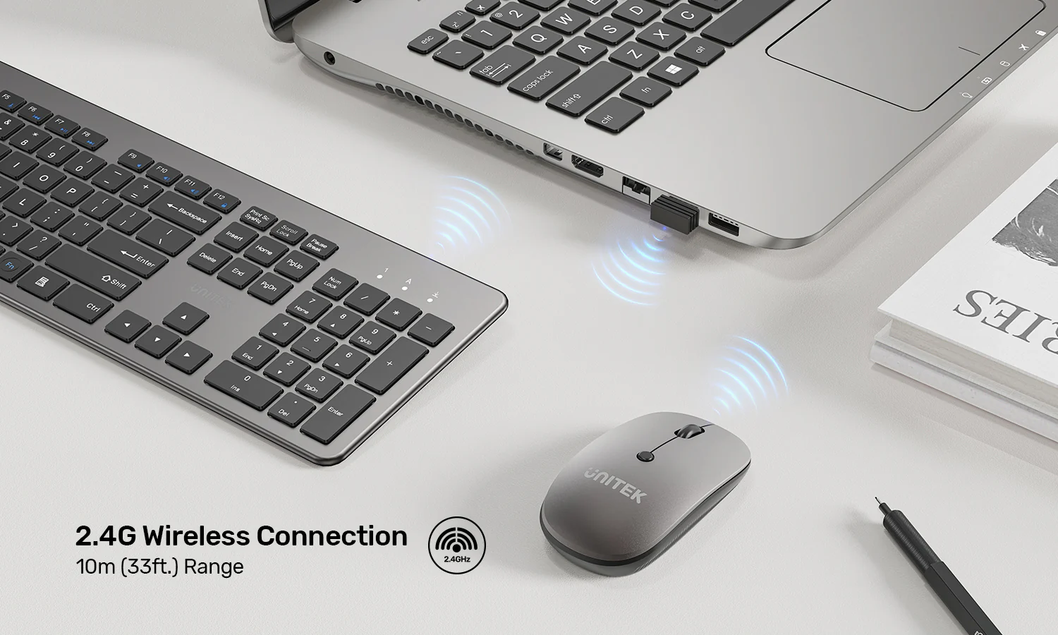 Unitek SlimDuo 2.4G Wireless Keyboard & Mouse Combo offers slim, silent design with ergonomic typing and 3 DPI settings. Plug-and-play, 10m range, ideal for office and home.