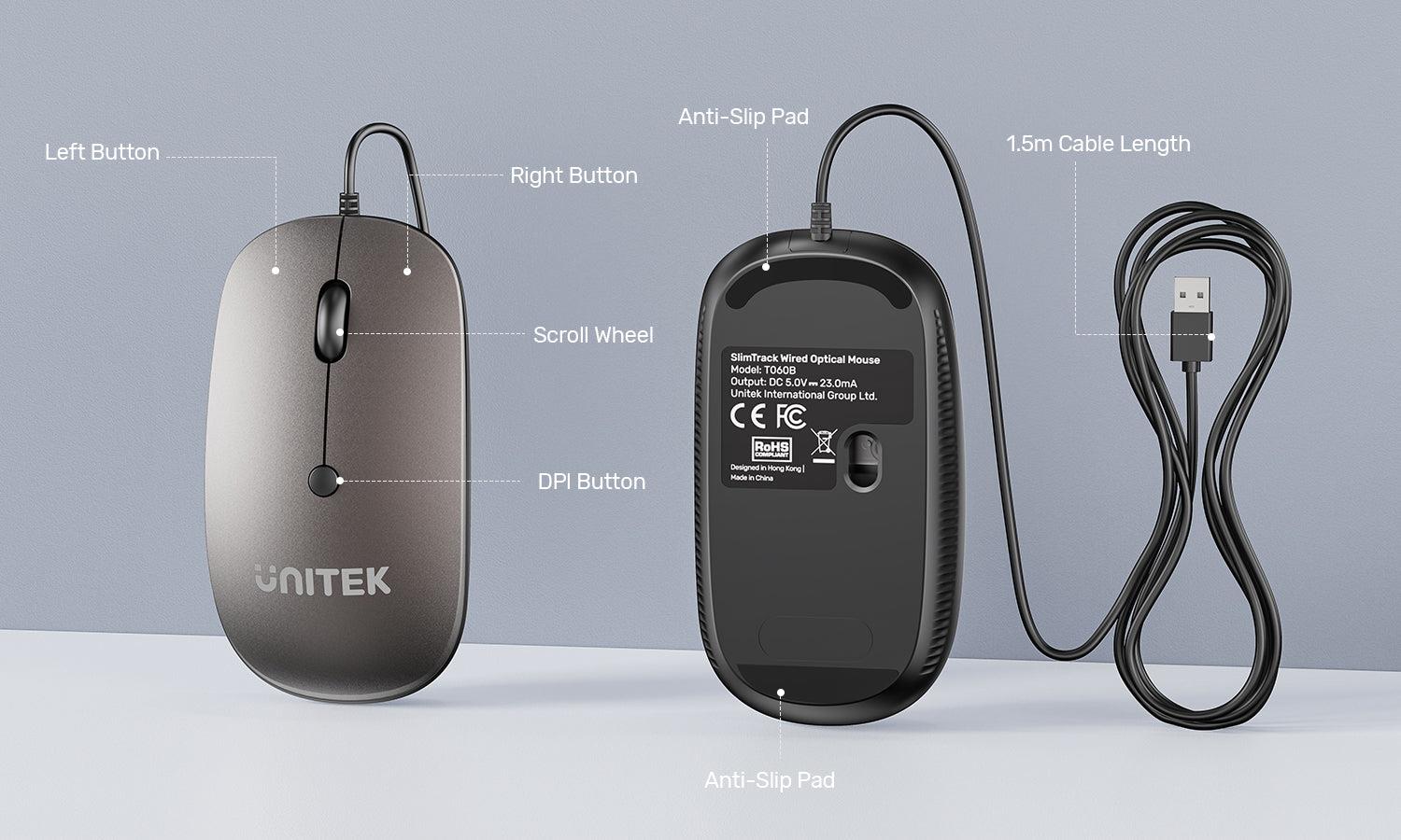 Unitek SlimTrack Wired Optical Mouse is designed for both right- and left-handed users, offering comfort and a compact profile that enhances your workspace without taking up much room.
