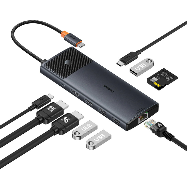 Baseus Metal Gleam Series II 10-in-1 USB Hub - Cosmic Black USB-C to 1x HDMI 4K120Hz - 1x HDMI 4K60Hz - 1x USB-A (10Gbps) - 1x USB-C(10Gbps) - 2x USB-A (480Mbps) - 1x RJ45 - 1x SD/TF + 1x USB-C(PD)
