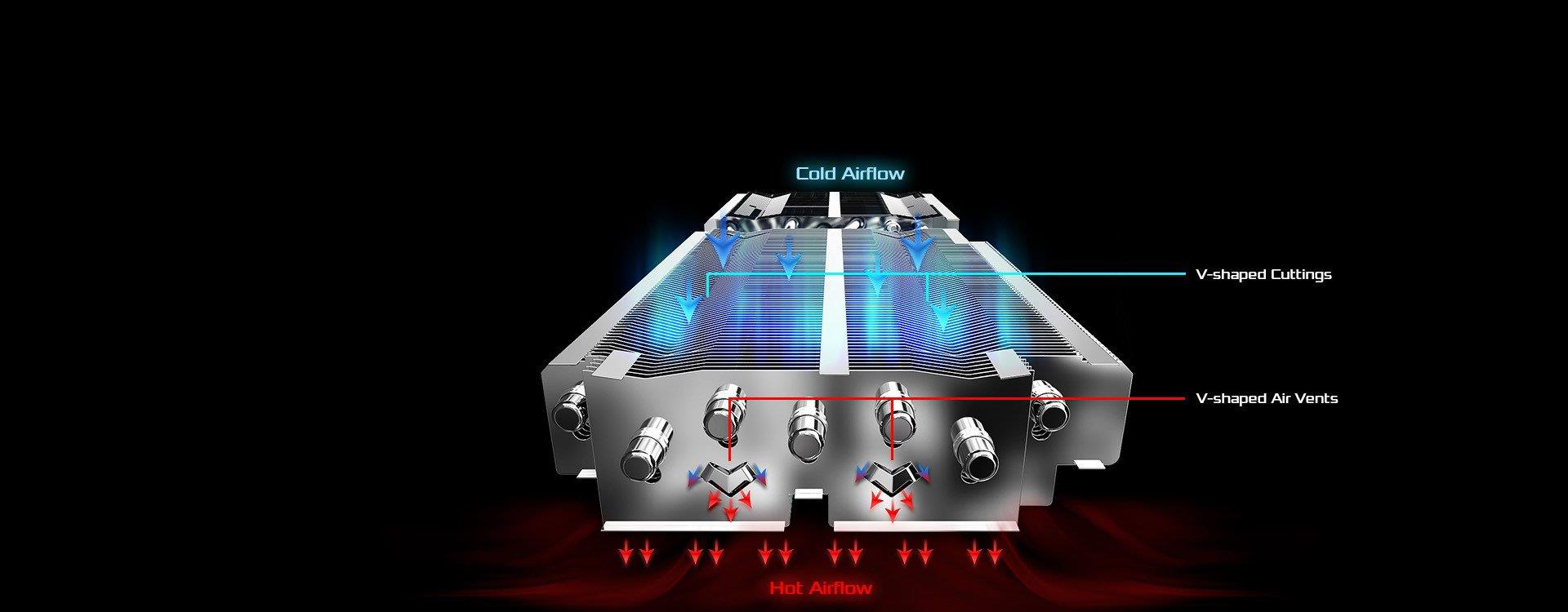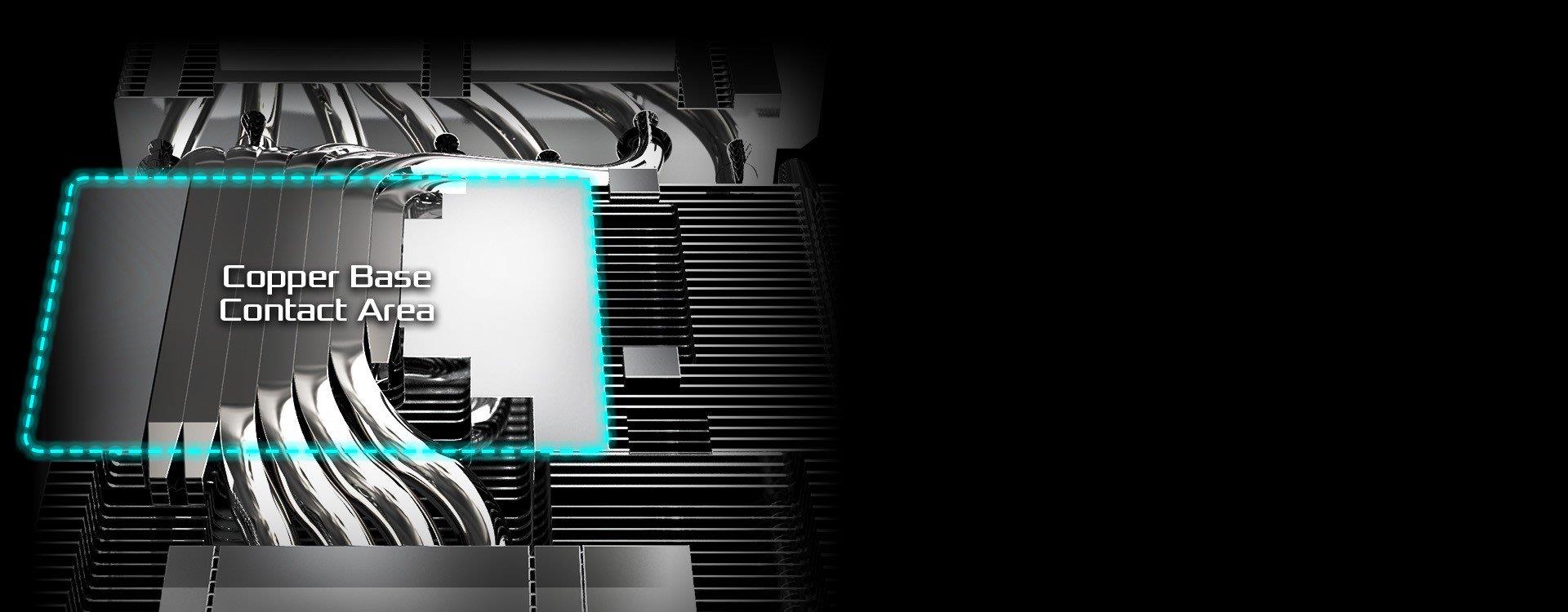 The heatpipes are consolidated to maximize the contact among each others and also the GPU baseplate for the optimized heat dissipation.