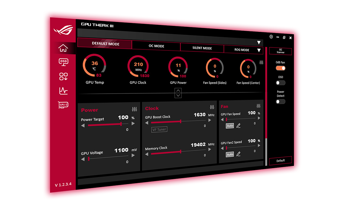 ASUS GPU Tweak III is more intuitive and feature-rich than ever before. A revamped interface offers greater accessibility by integrating core functions into a centralized dashboard, and our Voltage-Frequency tuner has been overhauled to make overclocking even easier. Additional goodies like 0dB fan technology, automatic profile swapping, a fully customizable on-screen display, and logging capabilities ensure that you get the most out of your graphics card.