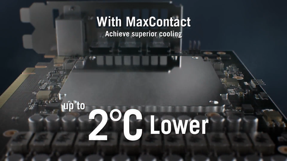 MaxContact is a special ASUS manufacturing process that effectively expands the surface area of the heat spreader that sits atop the GPU by 5%, compared to traditional designs. This improves temperatures by up to 2°C, in concert with an extensive heatsink array and powerful Axial-tech fans.