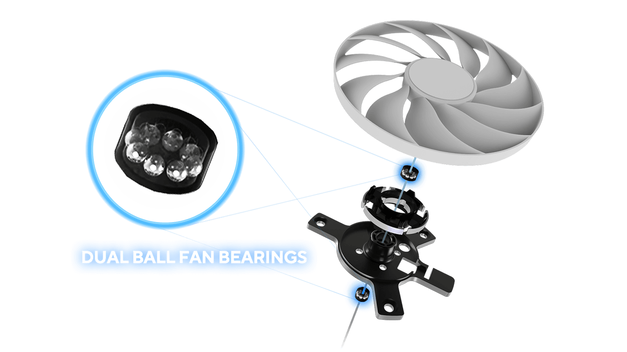Three tried-and-true Axial-tech fans feature a smaller hub that facilitates longer blades and a barrier ring to increase downward air pressure for lower temperatures, less noise and higher performance.