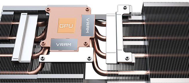 The copper plate directly contacts the GPU, coupled with the composite copper heat pipes, which quickly transfers the heat of the GPU and VRAM to the heatsink.