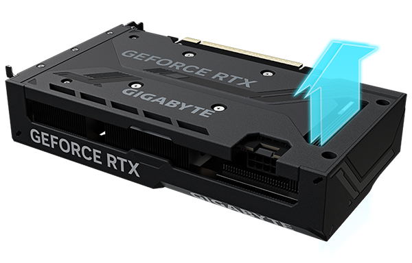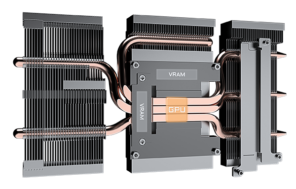 The shape of the pure copper heat pipes maximizes the direct contact area with the GPU. The heat pipes also cover the VRAM via a metal plate to ensure proper cooling.