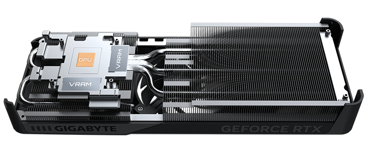 The copper plate directly contacts the GPU, coupled with the composite copper heat pipes, which quickly transfers the heat of the GPU and VRAM to the heatsink.
