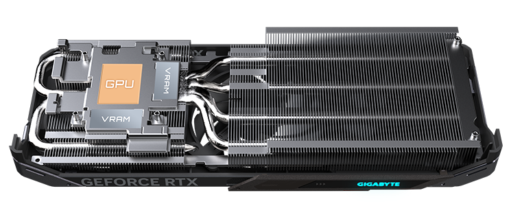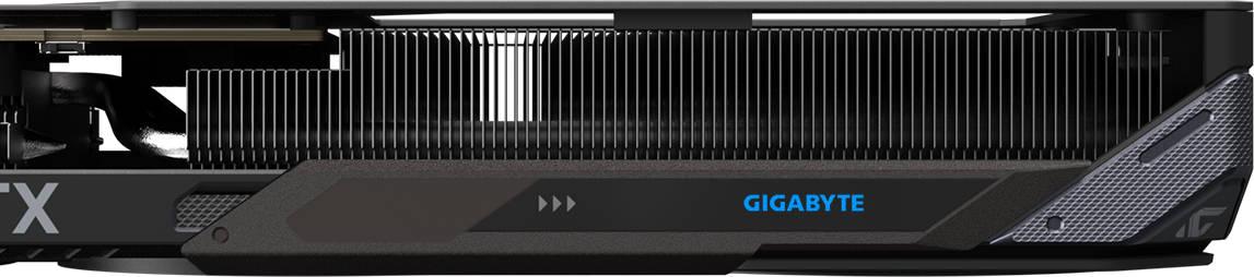 The copper plate directly contacts the GPU, coupled with the composite copper heat pipes, which quickly transfers the heat of the GPU and VRAM to the heatsink.