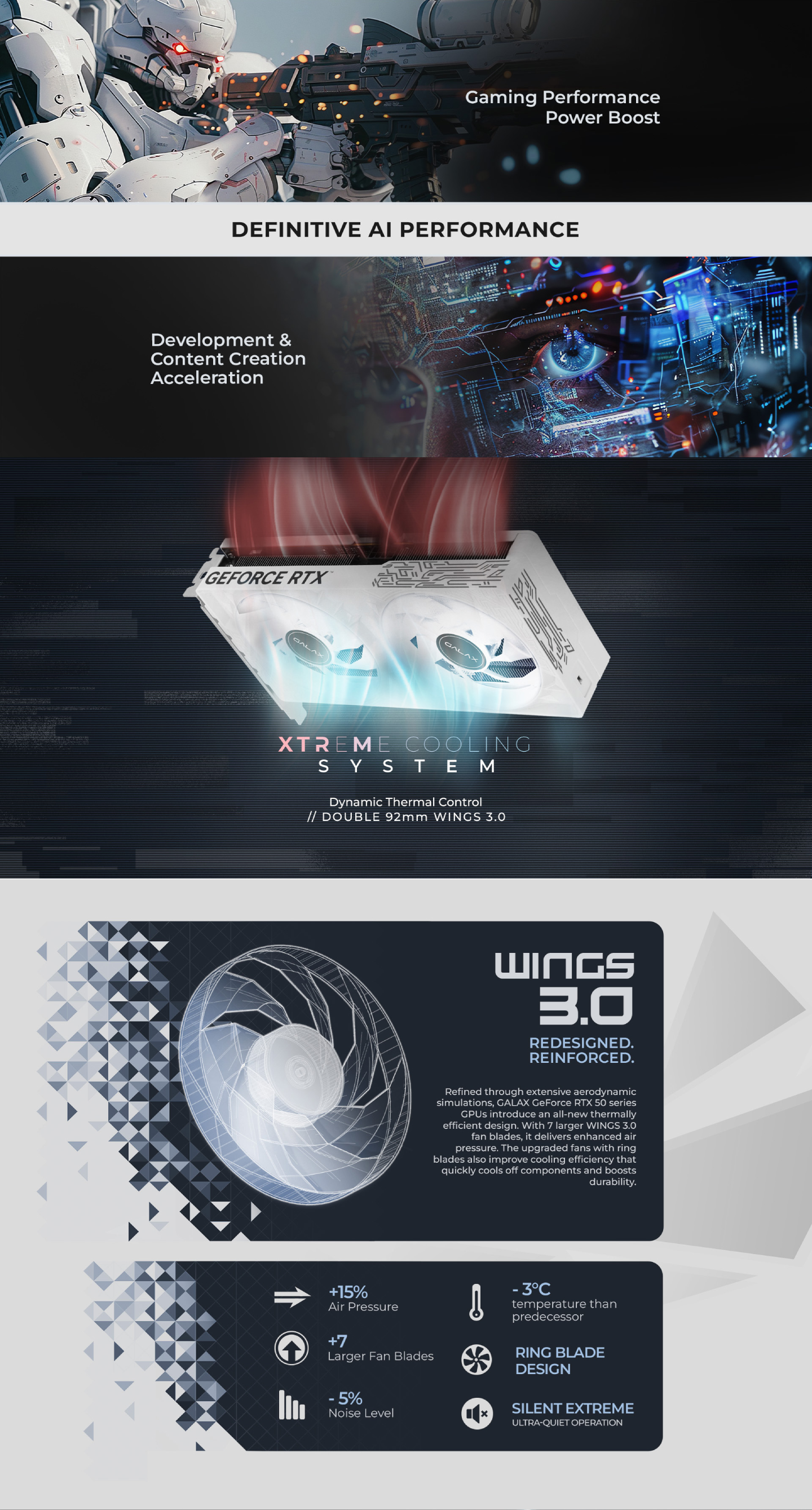 Joining the GeForce RTX 50 Series family, the NVIDIA GALAX GeForce RTX 5060 1-Click OC takes the stage as the latest addition of the brand-new lineup. Featuring 3*6mm heat pipes and the dual 92mm WINGS 3.0 fans that effectively dissipate heat of the graphics cards, the GPUs are optimized to run at optimal temperatures for sustained peak AI performance, letting the users to harness the groundbreaking power of NVIDIA's newest Blackwell architecture.