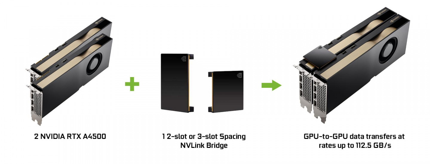 Connect two RTX A4500 cards with NVLink to double the effective memory footprint and scale application performance by enabling GPU-to-GPU data transfers at rates up to 112.5 GB/s (total bandwidth).