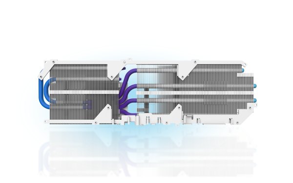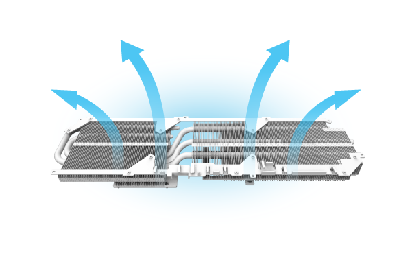 Four 6f nickel-plated copper heatpipes are aligned above the PCB, optimizing heat transfer from the GPU and VRAM to the cooling array.