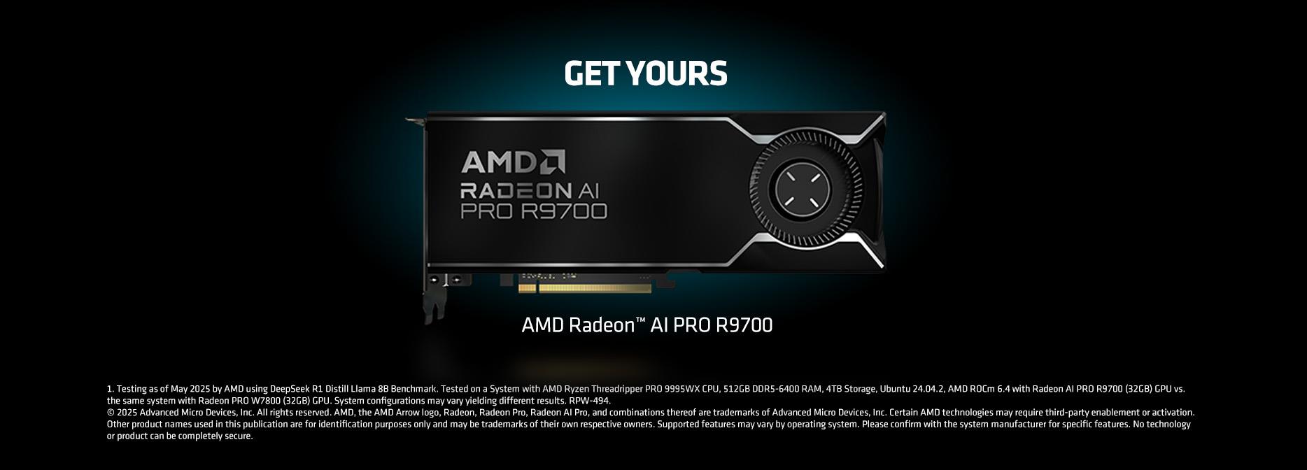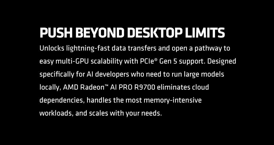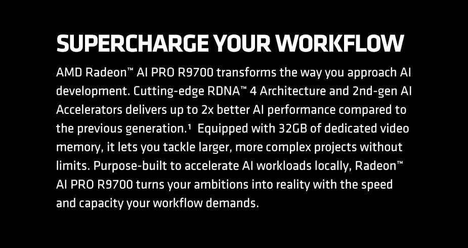 AMD Radeon™ AI PRO Series graphics cards are designed to accelerate advanced AI experiences and work on multiple machine learning frameworks, speeding up local AI workloads and processing large machine learning data sets.